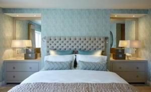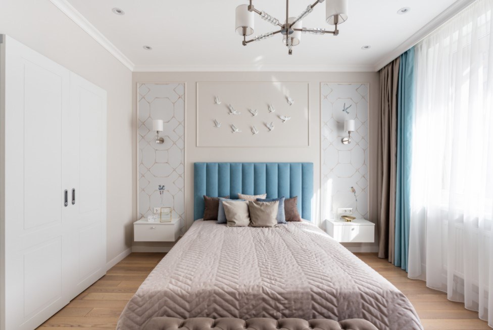 Спальные комнаты, выполненные в таких тонах, выглядят свежо и оригинально. Синий цвет в сочетании с бежевым отлично подойдёт тем людям, которые ценят элегантность и утончённость. Такие цвета плохо впишутся в интерьер детской комнаты за счёт того, то они создают ощущение сдержанности и строгости. Если говорить о преобладании одного цвета над другим, то советуем использовать больше синего цвета, разбавляя его бежевыми оттенками. При выборе оттенка синего цвета присмотритесь к более натуральным и приглушённым тонам.