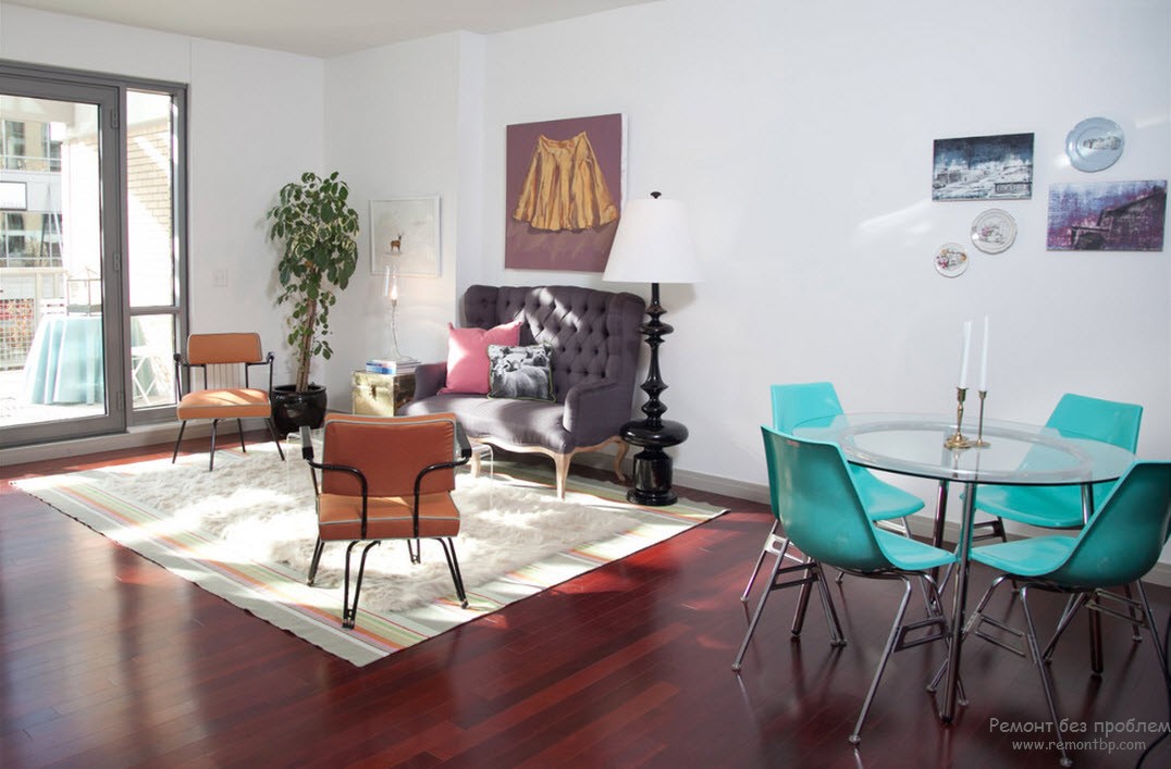 Стиль Эклектика на грани Китчевого. Только стены сглаживают конфликт и примиряют между собой таких разных обитателей гостиной. Им помогают объединить все воедино белые элементы мебели, наличники на окнах и пушистый ковер.