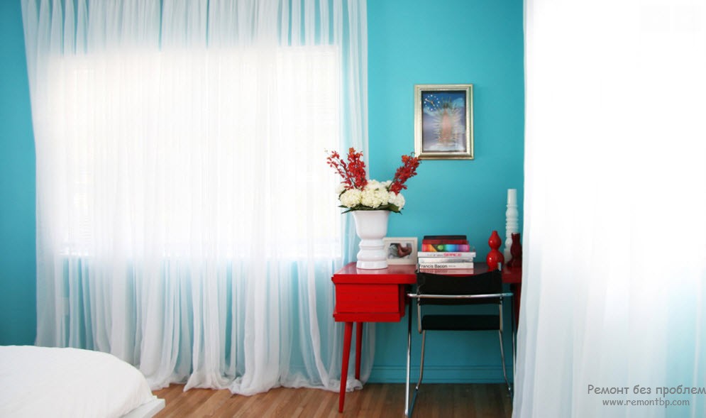 В современном интерьере Природного Минимализма очень уместными оказались бирюзовые стены.
