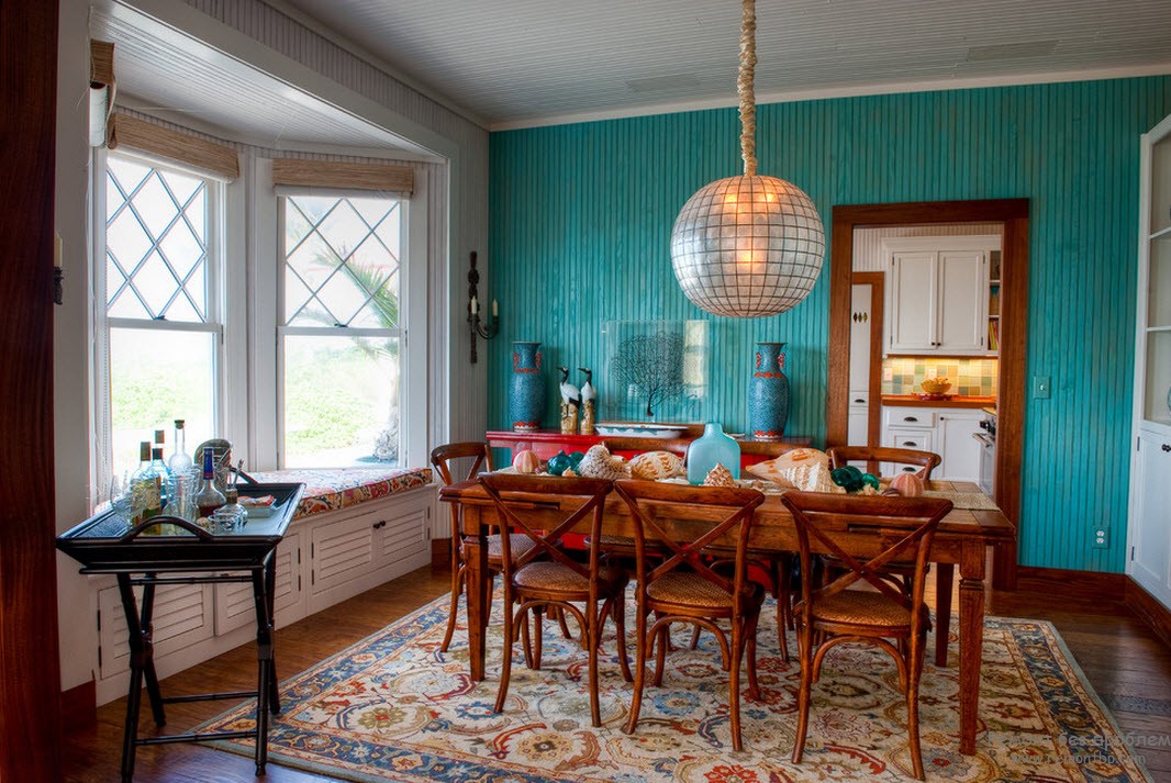 Дача любителей морских путешествий. Бирюза стены напоминает море, с которого привезено столько сувениров. Вазы тоже иностранки, но они держаться особняком, как дворяне в окружении простых людей.