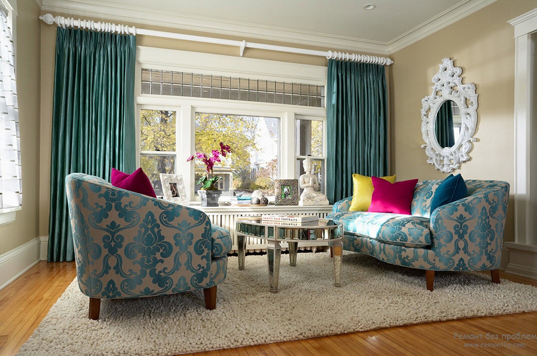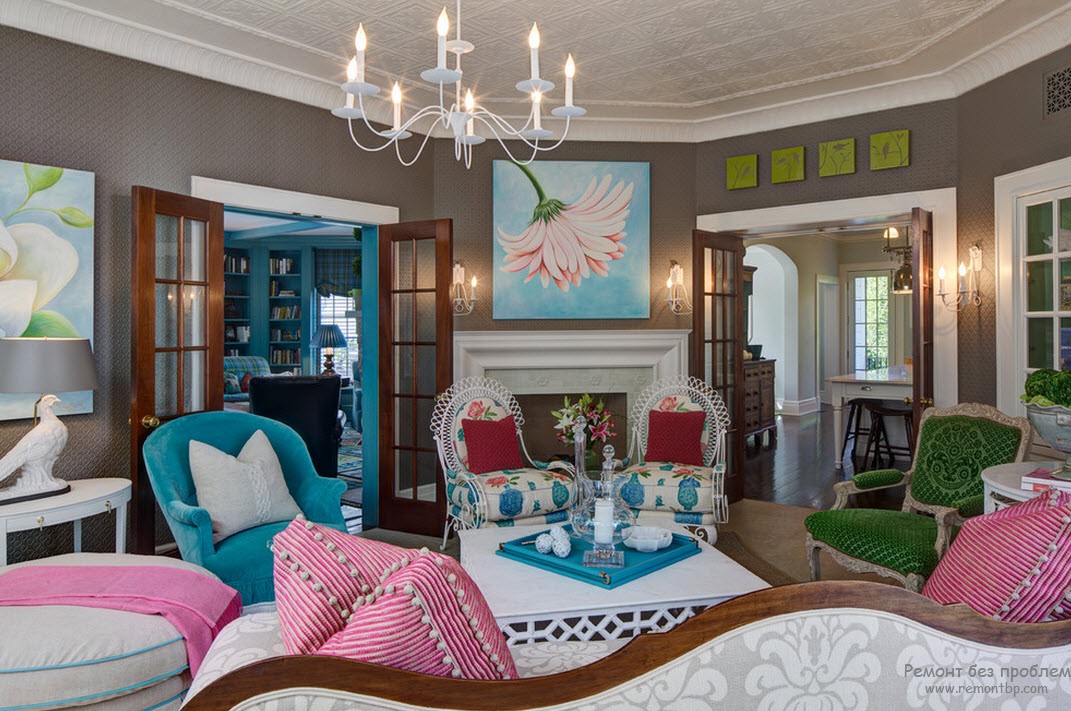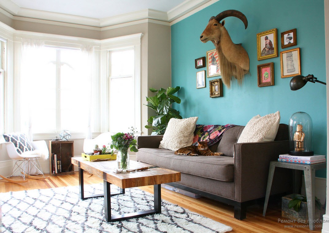 В стиле Эклектика обычно смешивают не только мебель и декор различных эпох, но и цвета. Уютный кабинет полностью окрашен в бирюзовый цвет. А в гостиной он присутствует только небольшими островками. Мебели много, но хочется посидеть именно в бирюзовом кресле хозяина.