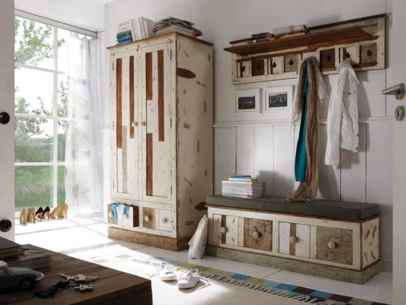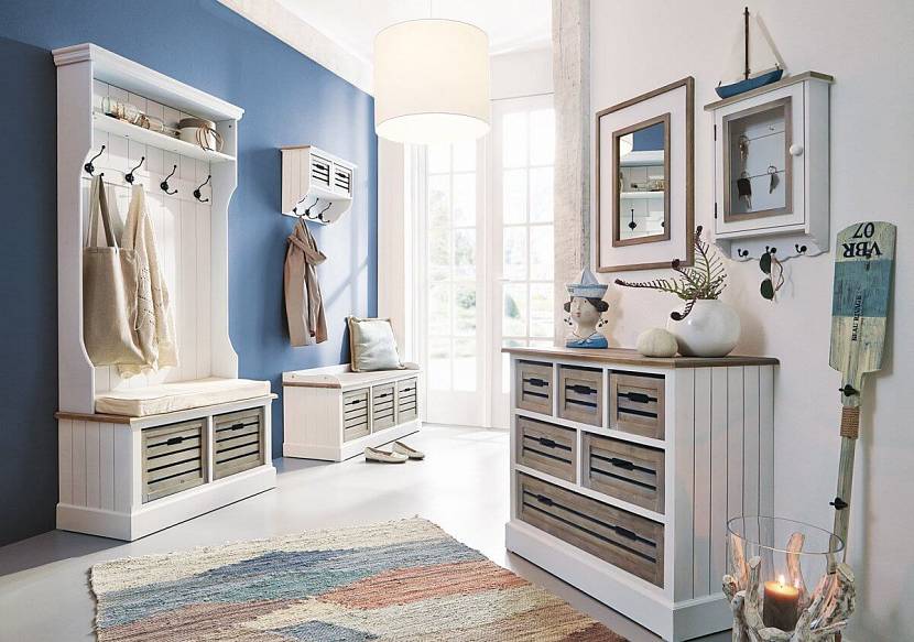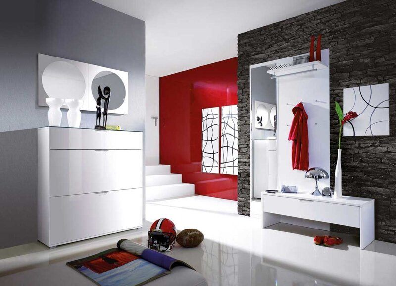 В дизайне интерьера определен основной набор мебельных элементов для прихожей достаточной площади. Состоит такой набор из шкафа или нескольких шкафов для хранения одежды и обуви, вешалки для повседневной и сезонной одежды, большого зеркала, скамьи, стула, пуфа, компактной обувницы.