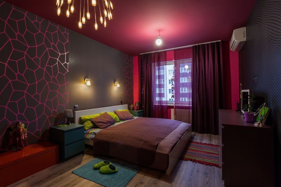 При выборе бордового натяжного потолка для спальной комнаты необходимо обязательно учесть некоторые особенности и нюансы: этот достаточно редкий и нестандартный цветовой вариант потолочного покрытия требует особенного внимания. Лучше выбрать глянцевое покрытие, зрительно увеличивающее пространство, которое может немного поглотить цвет бордо. Важно не перенасытить остальную часть интерьера спальни бордовым, лучше сочетать такой потолок со светлыми тонами и яркими акцентами: элементами декора и аксессуарами. Бордовый потолок – основа для реализации многих стилей интерьера от классики до восточного стиля.