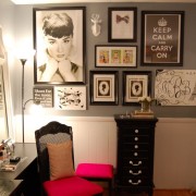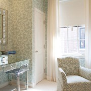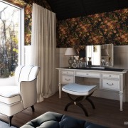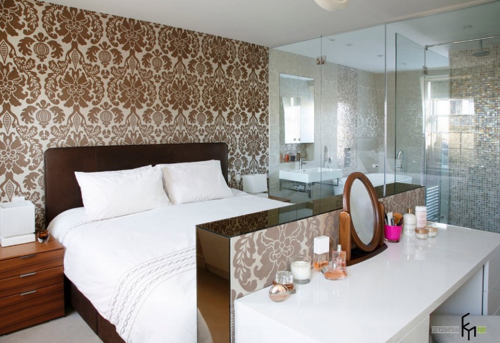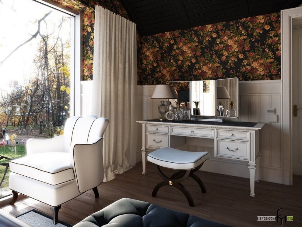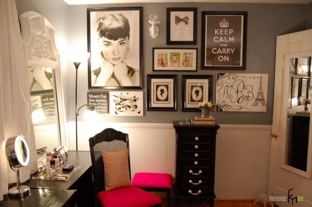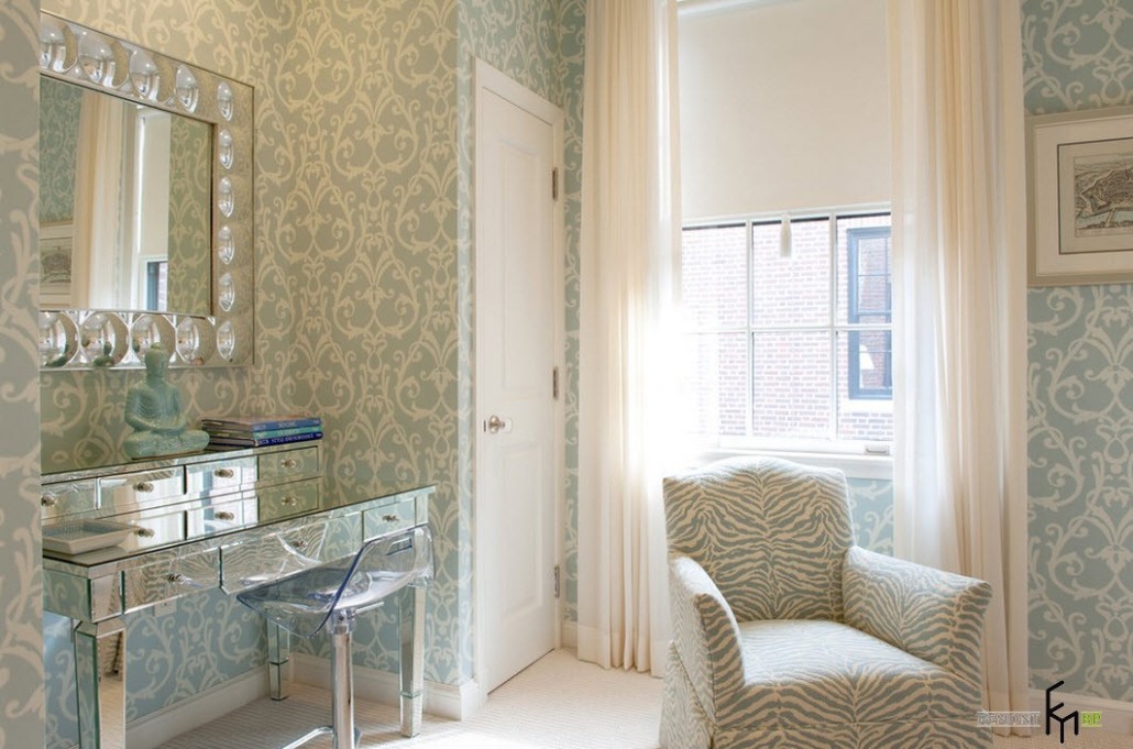 Зонировать пространство, отмечая место для ухода за собой, можно, используя два вида обоев. Путь один из них будет однотонным, а другой – с крупным узором. Одним из них можно оклеить все помещение, оставив второй для зоны будуарного столика. Кроме этого удобно использовать разные напольные покрытия. Достаточно накрыть место под столом пушистым ковриком и зона красоты будет обособлена. Идеальным разграничителем станет ширма. Она поможет скрыть таинства создания идеального образа вдалеке от посторонних глаз.