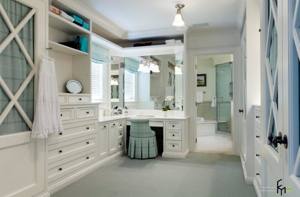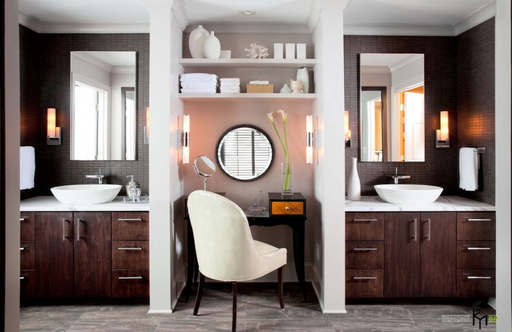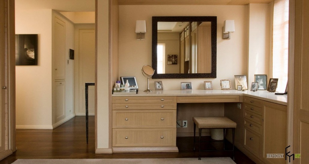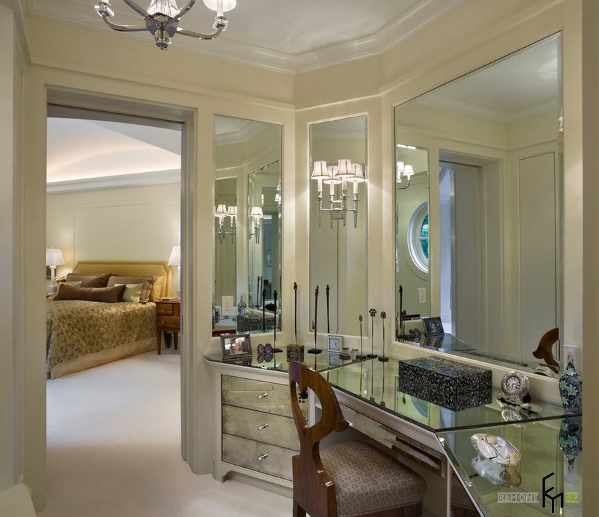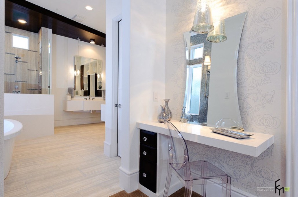 Обычно местом расположения выбирают спальню. Но можно поэкспериментировать, используя для этого холл или гардеробную, где достаточно освещения. Удобно размещать предметы личного использования в ванной. Но для установки здесь туалетного столика потребуется много места, которым не располагают стандартные санузлы.