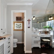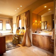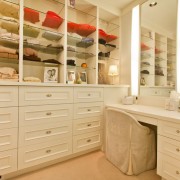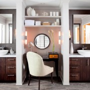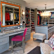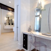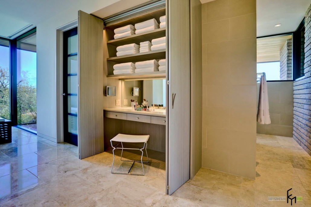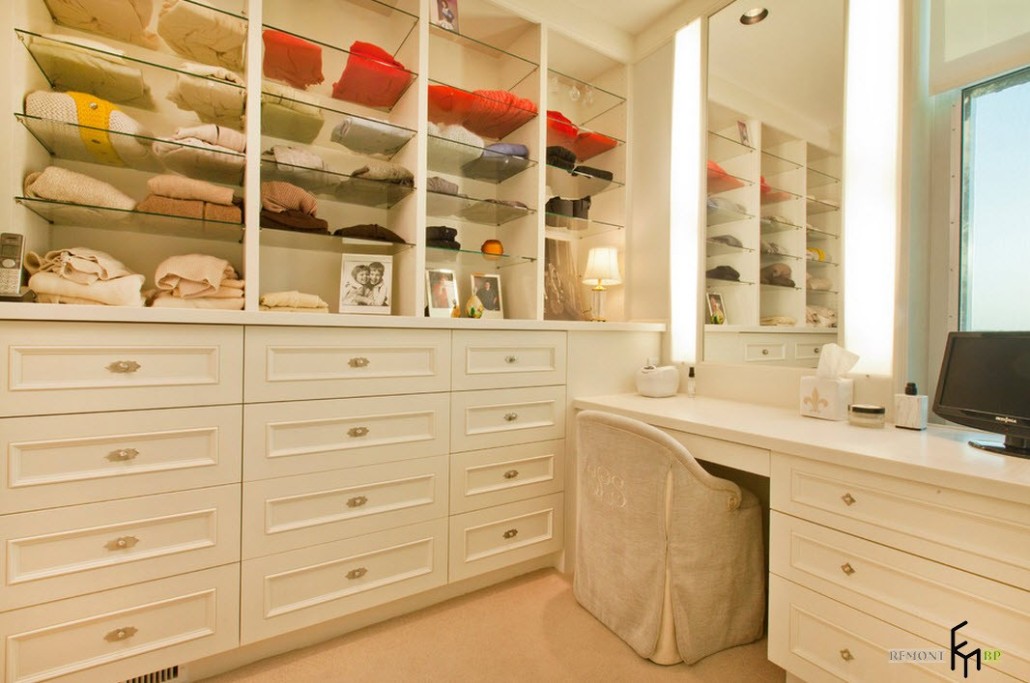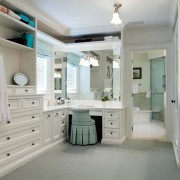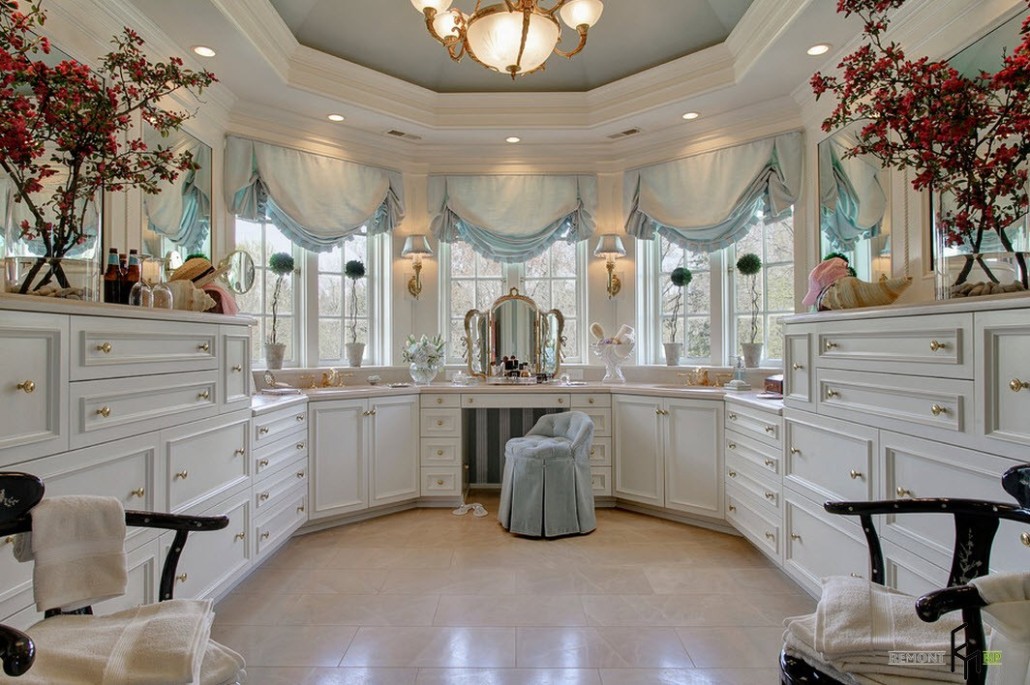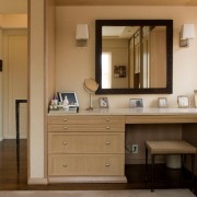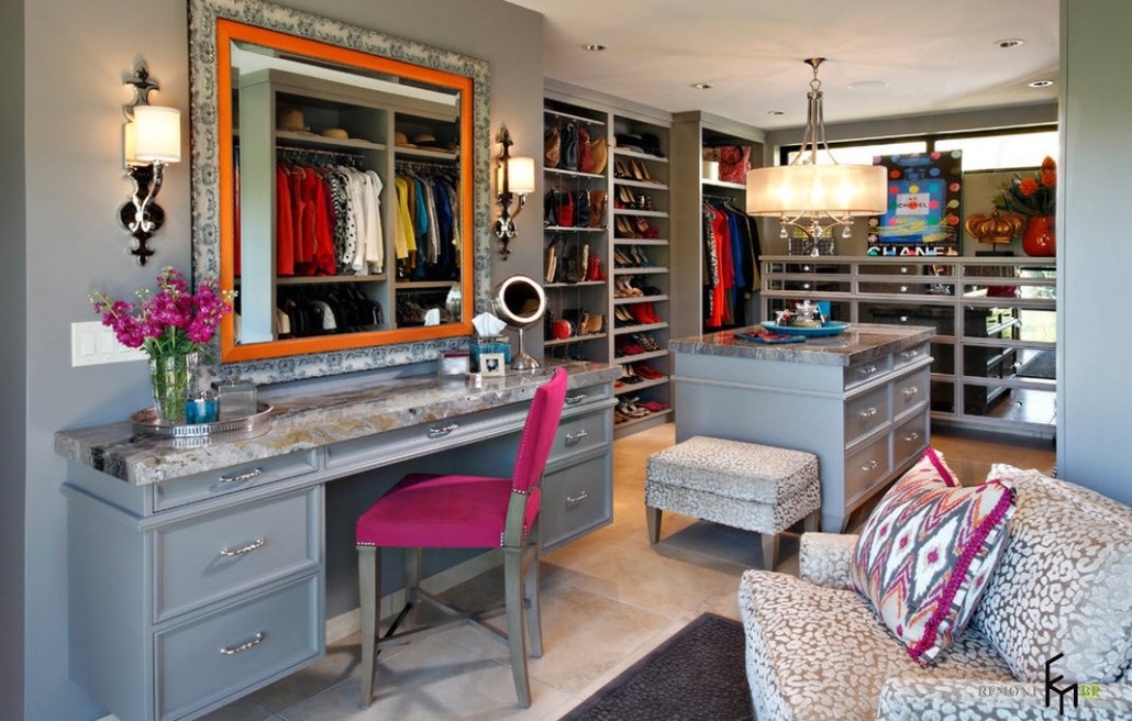 Обычно местом расположения выбирают спальню. Но можно поэкспериментировать, используя для этого холл или гардеробную, где достаточно освещения. Удобно размещать предметы личного использования в ванной. Но для установки здесь туалетного столика потребуется много места, которым не располагают стандартные санузлы.