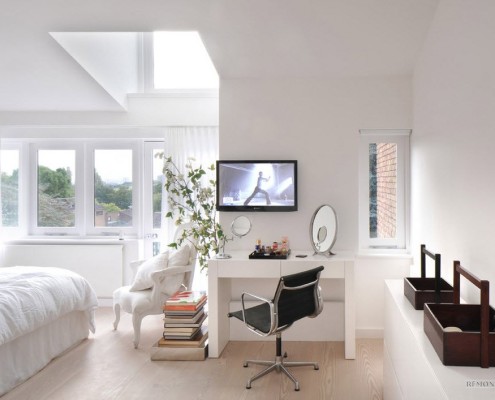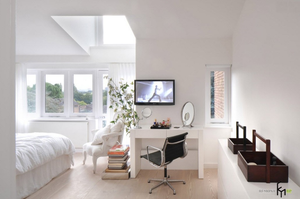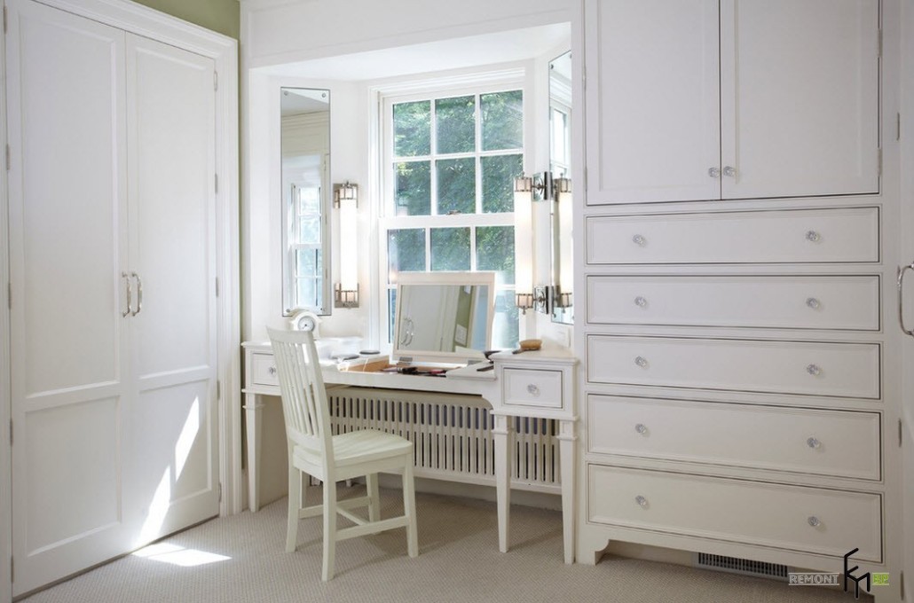 Туалетный столик не обязательно должен повторять цвет и форму остальной мебели. Если он обладает какими-то особенными качествами, то его даже нужно выделить цветом. В белой спальне темный элемент привлечет внимание. Выделяя этот предмет интерьера, можно зонировать пространство.