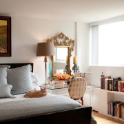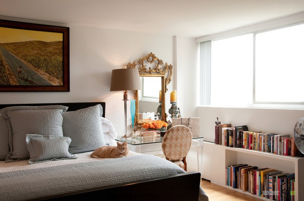 Зеркало на подставке также поможет решить многие проблемы. С его помощью любая удобная тумбочка может превратиться в изысканный будуарный столик. Подобрать зеркало к интерьеру проще, чем подобрать цельный будуарный стол. Поэтому использование одной из тумбочек от спального набора и зеркала в красивой раме будет подходящим дизайнерским решением.
