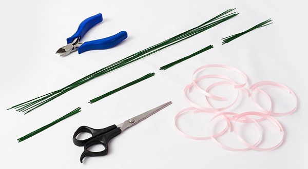 Для начала складываем несколько отрезков проволоки и делим их на четыре части одинакового размера. Также нарезаем тонкую ленточку на одинаковые отрезки.