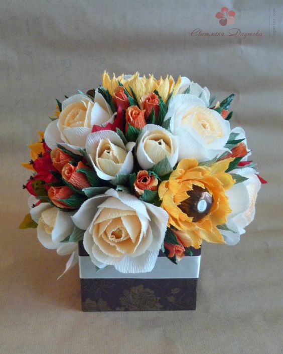Как видите, с помощью бумаги можно действительно оригинально оформить конфеты. Смотрится это очень красиво, современно. Поэтому будьте уверены, что такой презент порадует абсолютно каждого.
