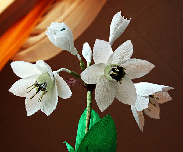 Из гофрированной бумаги белого цвета вырезаем лепестки. Фиксируем конфету на проволоке и вокруг нее прикрепляем лепестки с помощью горячего клея.