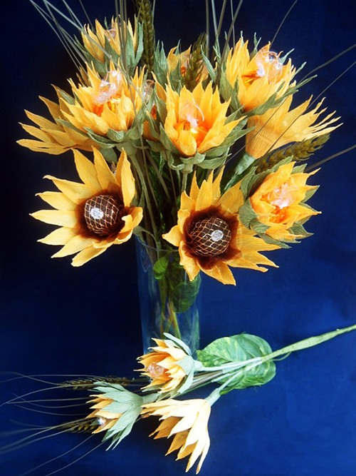 К заготовке с лепестками прикрепляем остальные конфеты на проволоке.