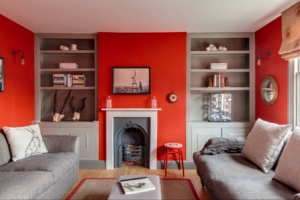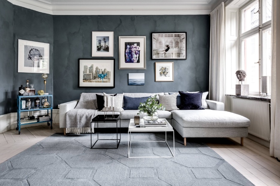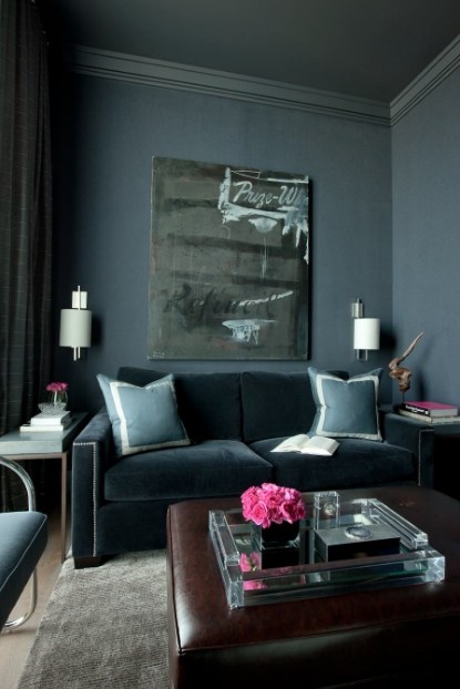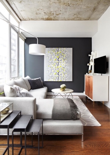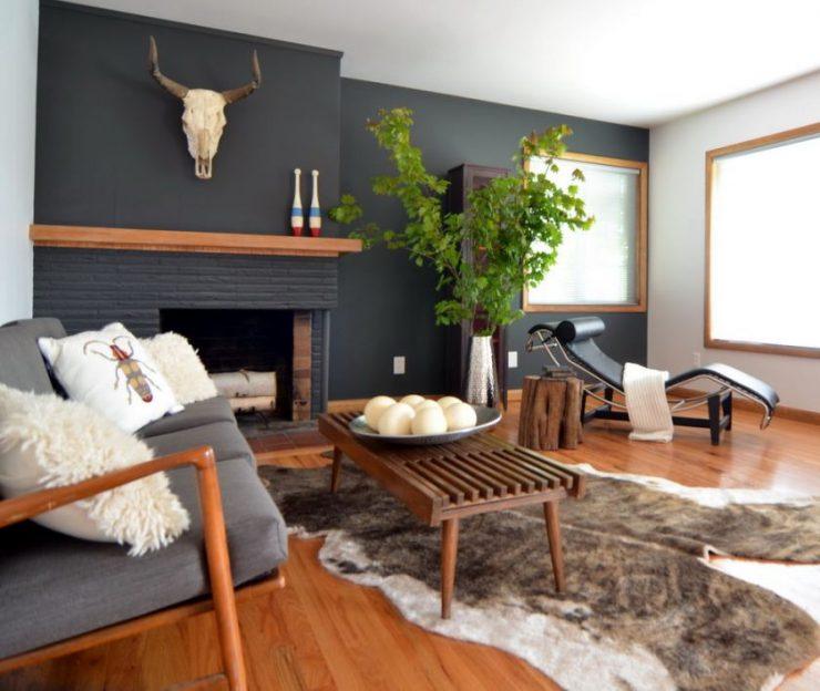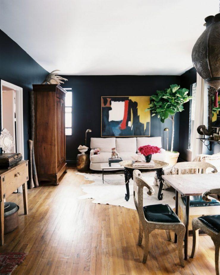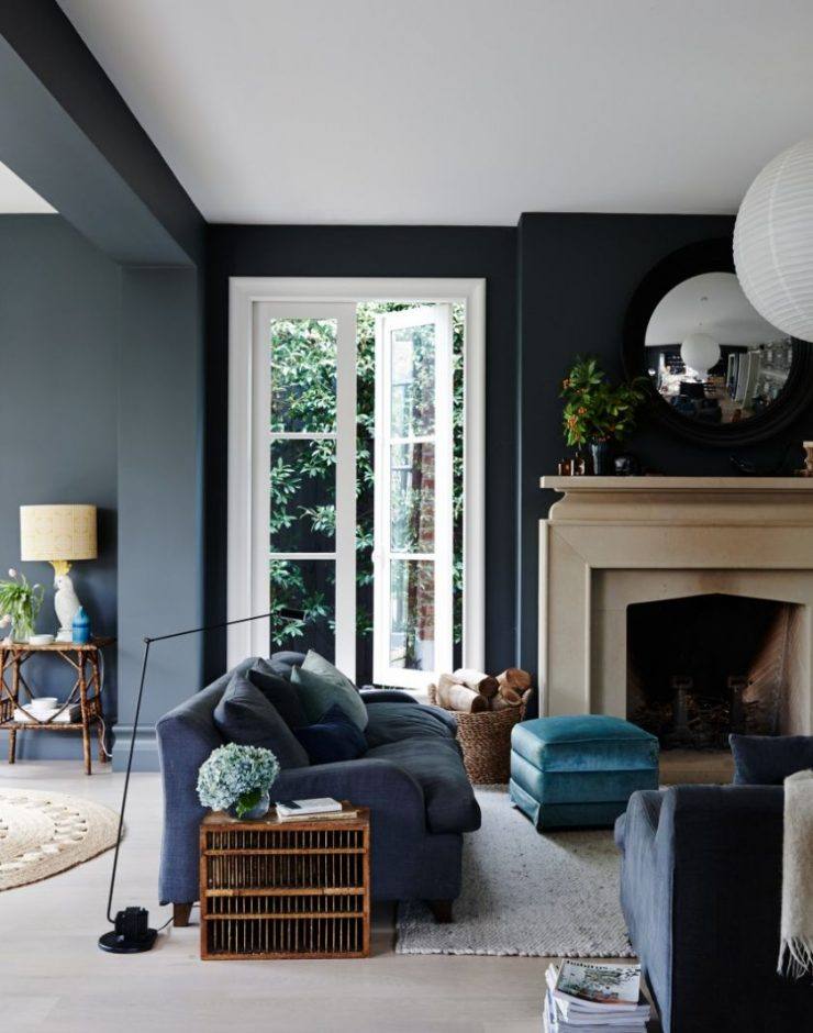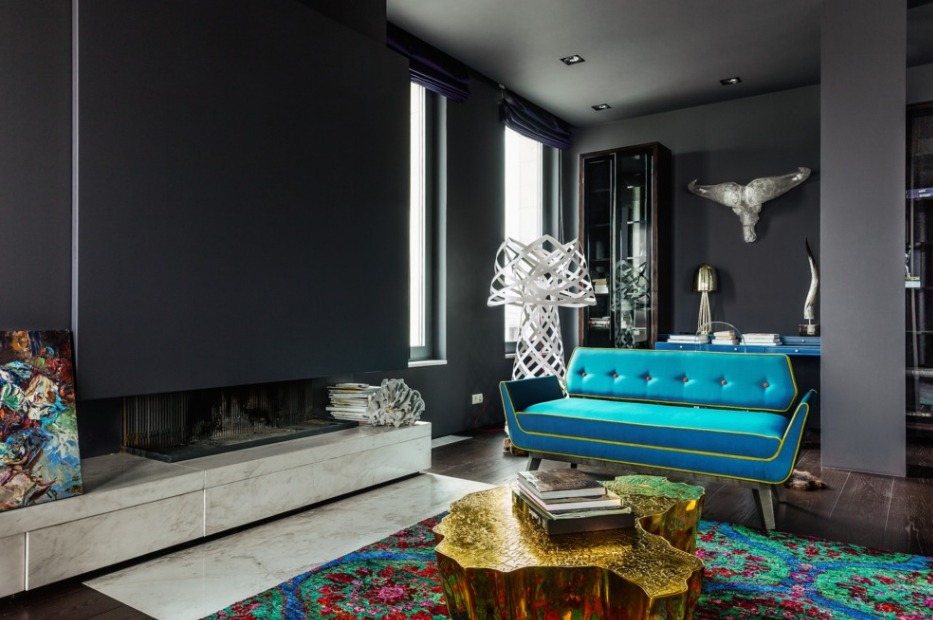 Также нередко темные стены комбинируют с мебелью в том же цвете. Но в таком случае другая часть комнаты должна быть контрастной, чтобы гостиная не была слишком мрачной. Такое решение свежее, интересное и точно придаст оригинальности каждому дому. Не менее популярным стало использование мебели контрастного цвета относительно стен и пола. Это придает гостиной шика и делает ее невероятно красивой.