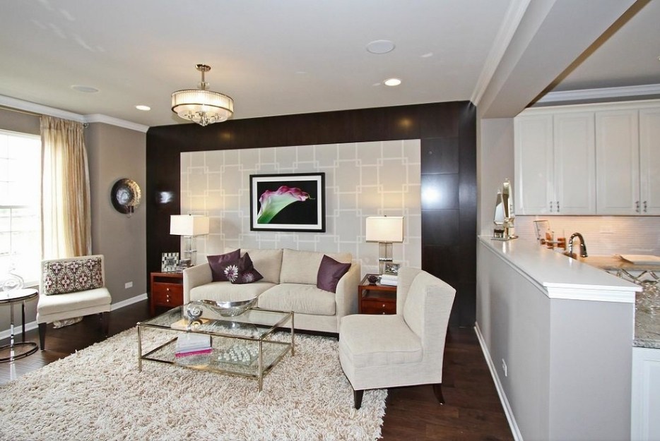 Немаловажным в этом деле является правильно подобранное освещение комнаты. Чем больше света будет в гостиной, тем более теплой она становится. В данном случае главную роль играет освещение на потолке, поэтому его необходимо продумать особенно тщательно, с учетом всех интерьерных задумок. Также обратите внимание на то, что свет может располагаться на стене.