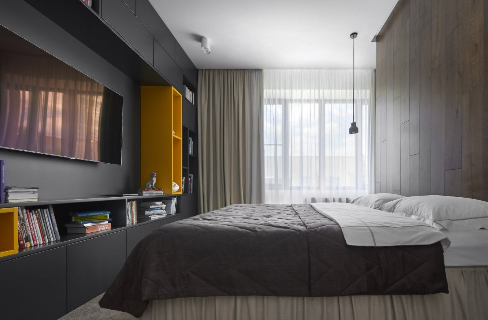 Многие ведущие дизайнеры интерьеров рекомендуют разбавлять лаконичный черно-белый интерьер спальни шторами или занавесками другого акцентного цвета, например, желтый, оранжевый, золотой, бирюзовый, серый и металлик.
