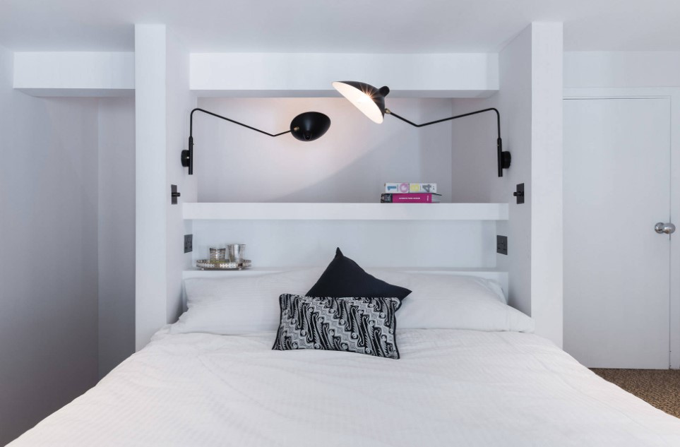 Для дизайна интерьера черно-белой спальни небольшой площади лучше использовать зрительно увеличивающий пространство белый цвет в отделке поверхностей, эргономичную, встроенную, угловую мебель или мебельные трансформеры.