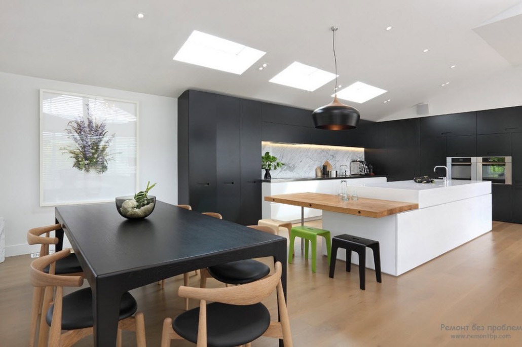 - Еще один интересный вариант оформления – разграничение. Что может быть элегантнее, чем белый верх и черный низ. К примеру, верхний ярус шкафов белые, а нижний черные. Такая обстановка визуально увеличит пространство и в тоже время оставит в нем некую загадочность с намеком на уединенность.