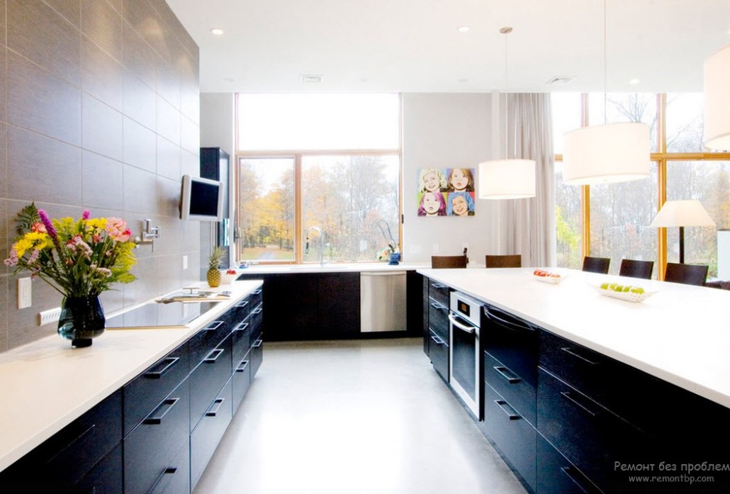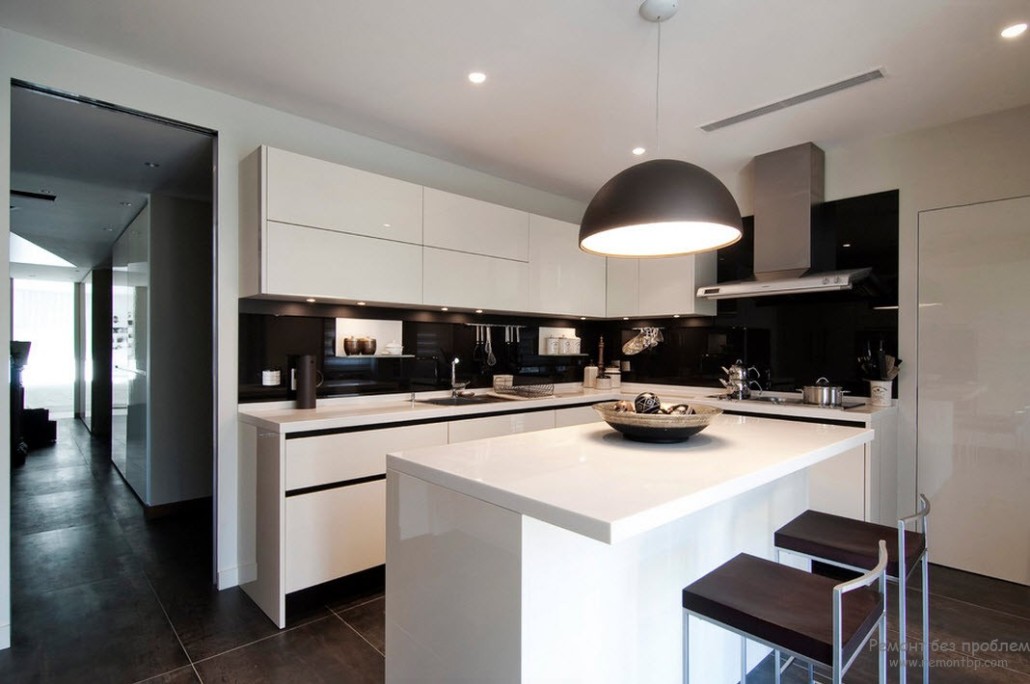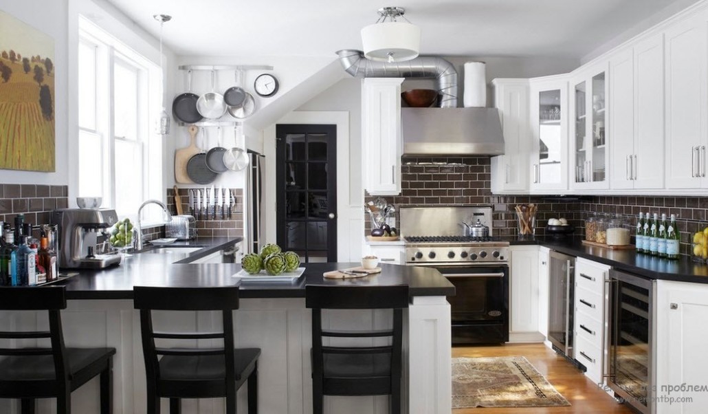 - Просто очаровательно смотрятся кухни с белым гарнитуром и черной рабочей зоной. К такой обстановке хорошо подойдут черная техника и табуреты или стулья. В качестве напольного покрытия можно использовать цвет темных пород дерева.