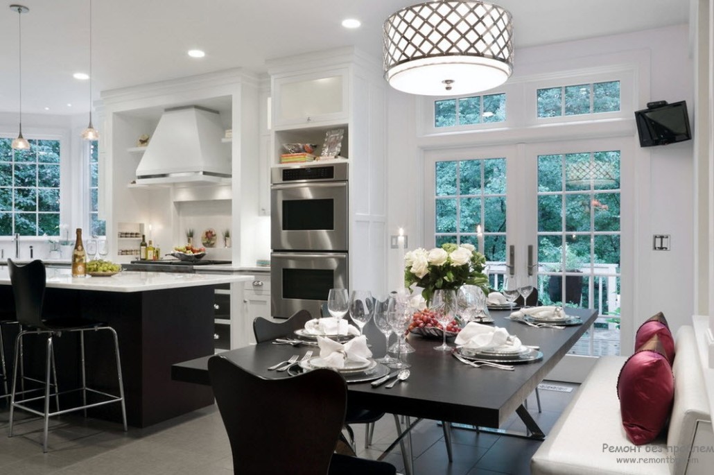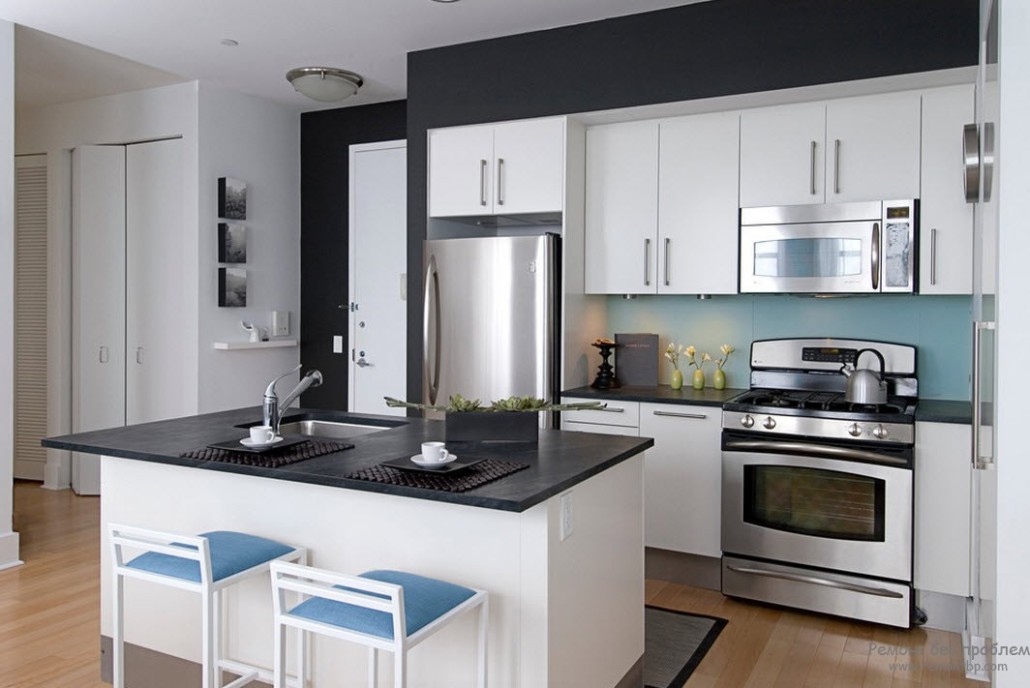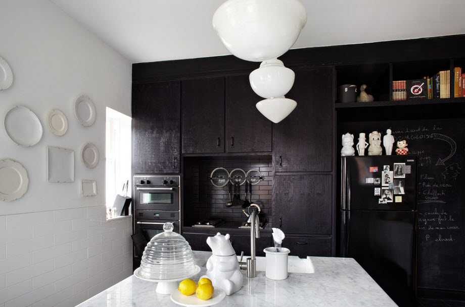 - В небольшом помещении идеально будут смотреться белые стены, потолок, оконные откосы и рамы, светлый пол и черный кухонный гарнитур. В качестве дополнения может быть использован текстиль с сочетанием белого и черного узоров, и разнообразные декоративные элементы, такие как статуэтки, вазы, и картины. Превосходно в такой ансамбль впишется стеклянный стол и белоснежные стулья.