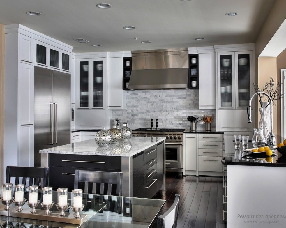 Сочетание черного с белым – это классика. И пусть кто-то считает такой ансамбль невыразительным скучным и примитивным, наперевес тому найдется огромное количество людей, которые по достоинству оценивают такое контрастное соединение тьмы и света. Именно поэтому черно-белые интерьеры помещений занимают одну из лидирующих позиций в дизайнерском рейтинге. Такое цветовое решение подойдет абсолютно любой комнате, но сегодня речь пойдет именно о кухне в черно-белых тонах.