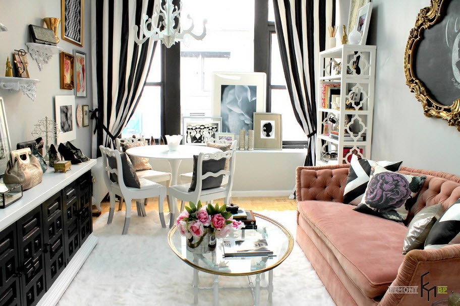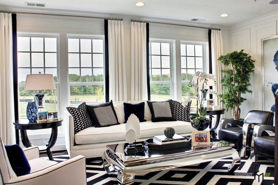 По такой же схеме формируется пространство ар-деко, который в принципе обозначен сочетанием до 3 цветов. Именно он идеально подходит для черно-белого гламура. Полированный глянец темных поверхностей или отделки из макассара, согласно стилистической идее, перекликается со шторной белизной. Инкрустированные столики из стекла или темного дерева, безделушки из эбонитового дерева вкупе с коллажем фотографий в рамках под серебро, подушки с блестящими аппликациями работают на пользу интерьера.