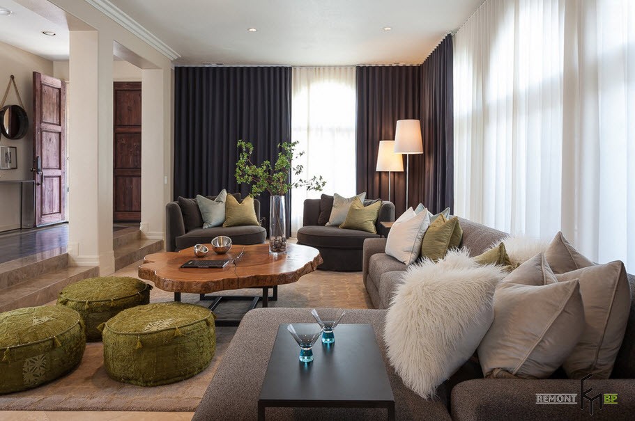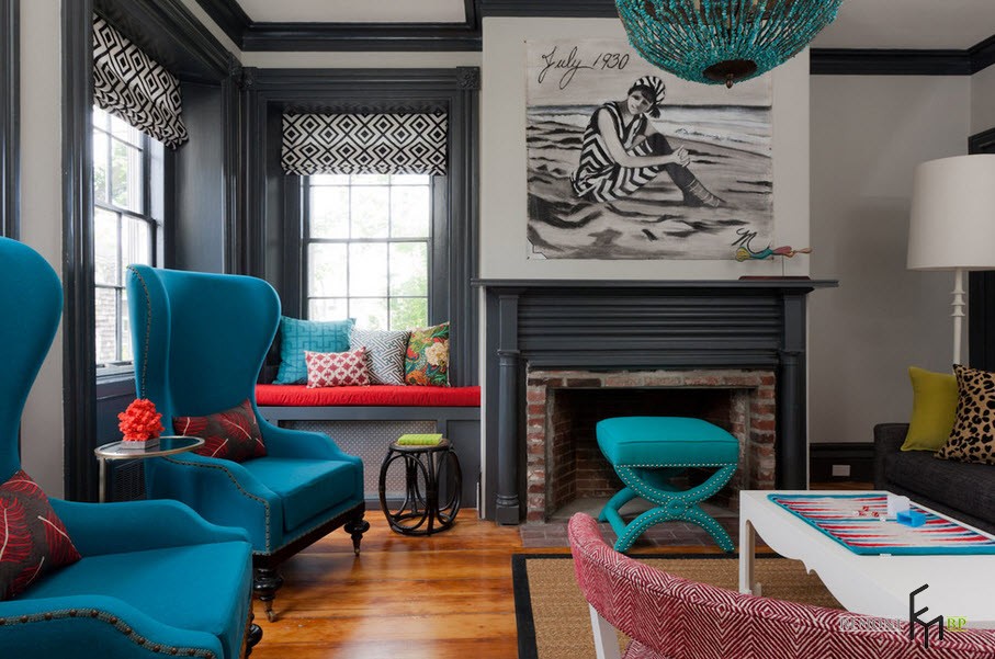 Если предпочесть голубую или бирюзовую обивки кресел и дивана, остается только наслаждаться дружественной атмосферой тонов. При этом окна допускается драпировать по-разному. Актуальны задействовать конструкцию темных римских штор с «рябенькими» ночными портьерами. Как альтернатива – веницианские жалюзи и «шашки» в виниловым настиле пола.
