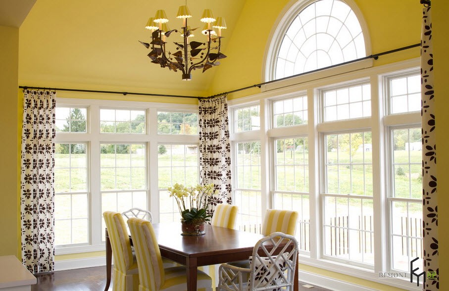 Исходя из присутствия двух солирующих цветов, интерьер в этой гамме может быть интересным и оригинальным, если присовокупить насыщенные краски. Ведь «теплые» дизайны тоже никто не отменял. Занавеси, дублирующие цвет стен, покажутся скучными. А вот яркие стены залотисто-бежевого и спокойный колеров «развеселят» узорчатые гардины в контрастирующих тонах. Придадут парадности светильники с позолотой и люстра, выполненная в том же духе. Впрочем, лавируя между белым и желтым можно создать много солнечных акцентов на текстиле. Если привлечь в обивку темный, ощущения от композиции сменятся сдержанной классикой.