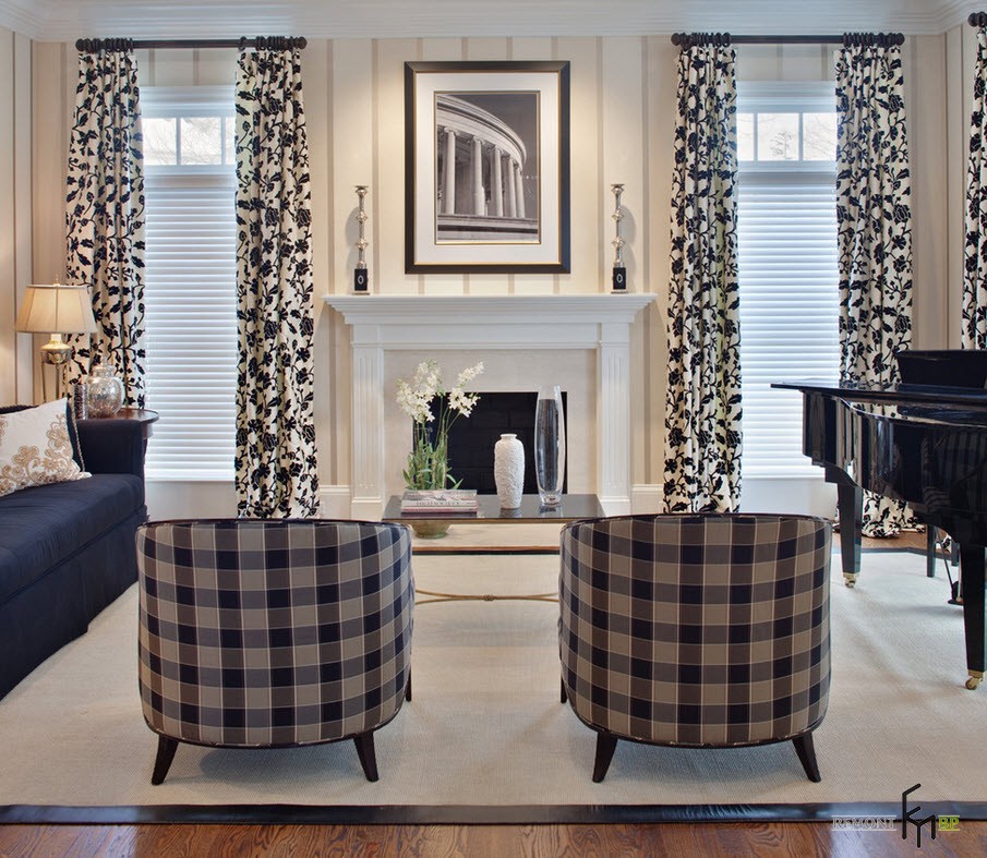 Если от яркости снега и угля режет глаза, отдайтесь на волю оттенков. Молочный, цвет слоновой кости и прозрачность кремового убавят контрастности, при этом отрицательно не сказавших на декоративном эффекте. Черный тоже не одинок в своем роде и предлагает разнообразие в виде пушечного металла, копоти на лампе, эбонитового дерева. Их совмещение на шторных отрезах материализуется в шашечках, крапинках, зигзагах, полосках, природных мотивах, иероглифах и прочей дизайнерской фантазии.