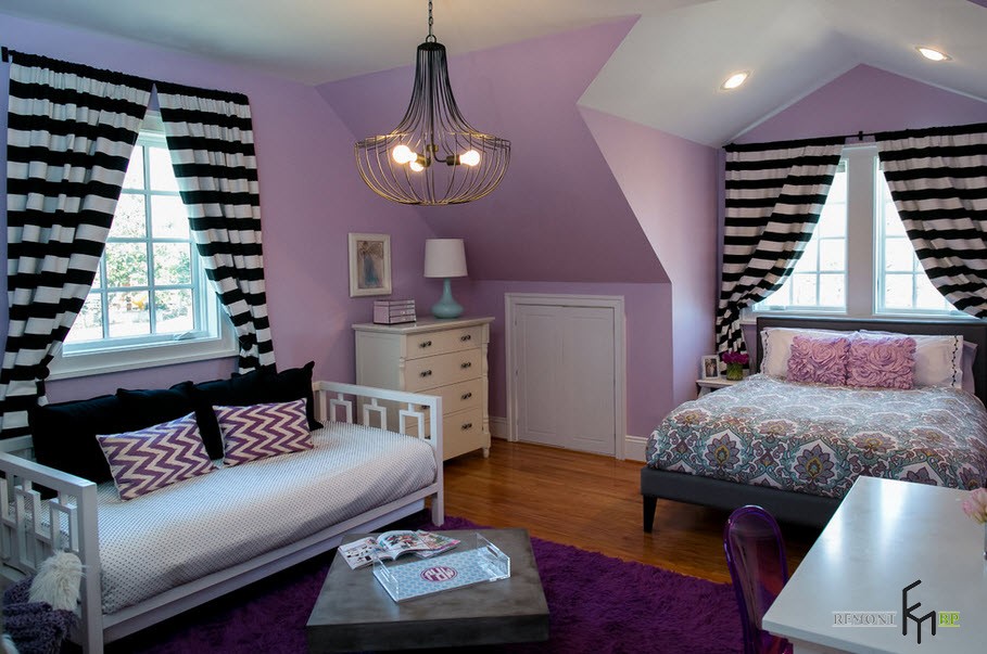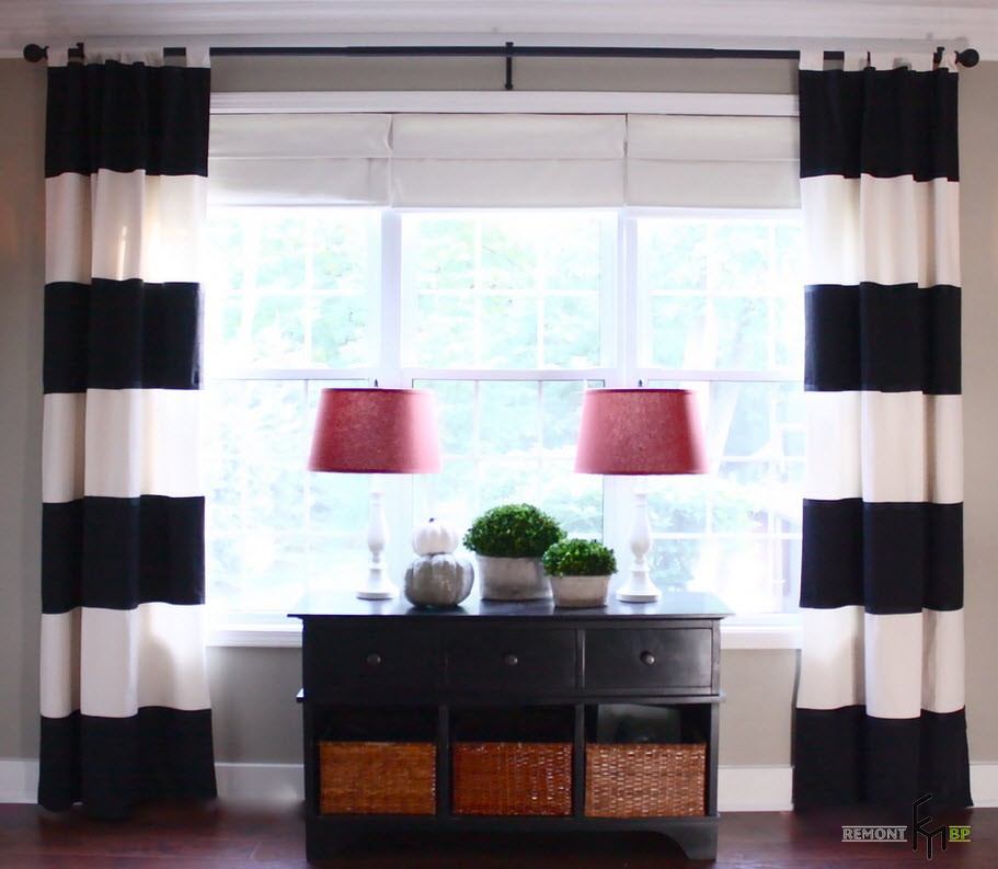 Согласитесь, что черно-белая гармония обладает замечательной особенностью привносить стильности и шика. Контрастные стикеры, постеры в гармонии с занавесями помогут воссоздать атмосферу интеллигентного ретро. Сюжетный ряд из фотографий в тонких рамах заданной темы, и темный глянец полос на шторах в совпадении геометрической раскладки идеальны для антуража.