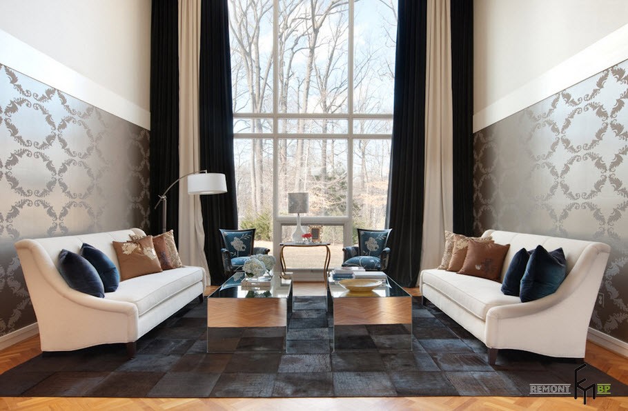 Давайте вспомним старое кино, эффект от двухцветных кадров с налетом элегантности и поиграем с противоположными бликами. Для начала тестируем белые шторы и мебель на фоне темной облицовки стен и пола. Красиво, но для создания антуража лучше использовать аксессуары, имитирующие дорогой блеск металлов.