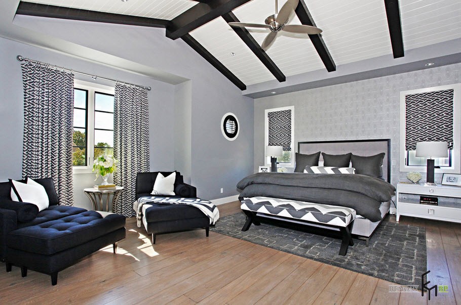 Спальня в заданной тональности выглядит образцово-показательной. Стоит обыграть сизо-синие или фиолетовые стены контрастной драпировкой с принтами, и случиться мгновенная трансформация. Мобильные декор в виде торшеров, гравюры и пару эстампов на тему природы тоже представляет интерес для такого украшения, при этом особенно выразительны полосы. Используйте в сюжете с двухполосными шторами спальни 1-2 цветовых ударения. Покрывала и полотно римской шторы в оранжевом исполнении бросят отблеск пламени на весь интерьер. Объемный черно-белые подушки с золотыми вставками из лент составят пару ночным портьерам
