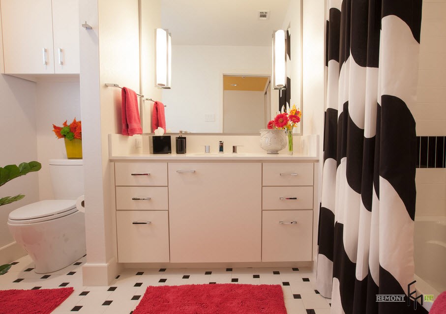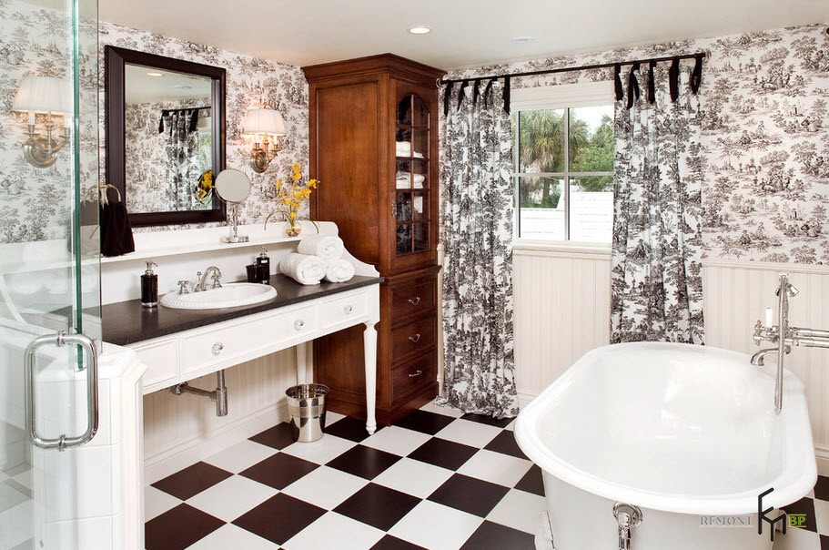 Если речь заходит о черно-белой ванне или кухне, сразу понятно, что интерьерные «пешки» придется приблизительно расставлять по клеткам. Эталонное решение и графичное исполнении продолжит оконный ансамбль или занавеска для душа. Причем они могут повторять декор пола, содержать произвольные мотивы или сформировать квартет из 4 самостоятельных полотен обоих цветов.