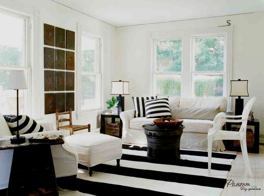 Если черный цвет – это олицетворение классики, то черно-белое сочетание и подавно. Если не можете выбрать цвет одежды на какое-нибудь торжество, то просто оденьте что-нибудь черно-белое, и вы не прогадаете. Для интерьеров это правило тоже подходит. Но что здесь важно учесть? Используя два этих полярных цвета, нужно помнить, что они как бы дробят пространство на части. И если черные и белые детали мелкие, то комната превратится в мозаику. Поэтому лучше, если эти детали будут крупнее. Из этих же соображений не стоит увлекаться строгостью линий – это опять же приведет к эффекту дробления. Но и слишком плавные линии не подойдут – это сделает интерьер размытым. Лучше остановиться где-нибудь посередине: немного строгих и немного плавных линий. А для любителей шахматных клеток и черно-белых полосок стоит помнить, что это утомляет глаза и способствует замкнутости. Чтобы этого избежать сделайте это на белом фоне, он отвлечет внимание и расслабит напряжение.