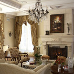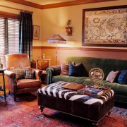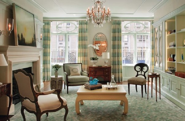 Ковры, как правило, не обладают внушительными размерами и обязательно оставляются открытой часть пола. Зачастую их располагают по середине комнаты, тем самым, акцентируя внимание на ее центре. Что касается штор и занавесок, то наиболее часто для их изготовления используются такие материалы как муслин и бархат. На шторах в качестве декора используются кисточки.