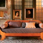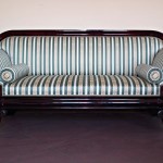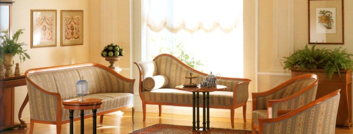 Волне допустимо присутствие в таких интерьерах мебели с мягкой обивкой (скамьи, стулья и т.д.) и мягкой мебели. Для обивки не обязательно использовать однотонные материалы, вполне уместно будет смотреться обивка в полоску или с небольшим узором. К тому же сама обивка должна крепиться при помощи специальных гвоздей с большими декоративными шляпками. В остальном же декорирование мебели в стиле бидермейер не может похвастать богатым разнообразием. Как правило, все видимые деревянные детали попросту покрываются цветным или прозрачным лаком.