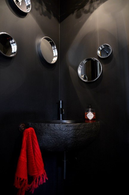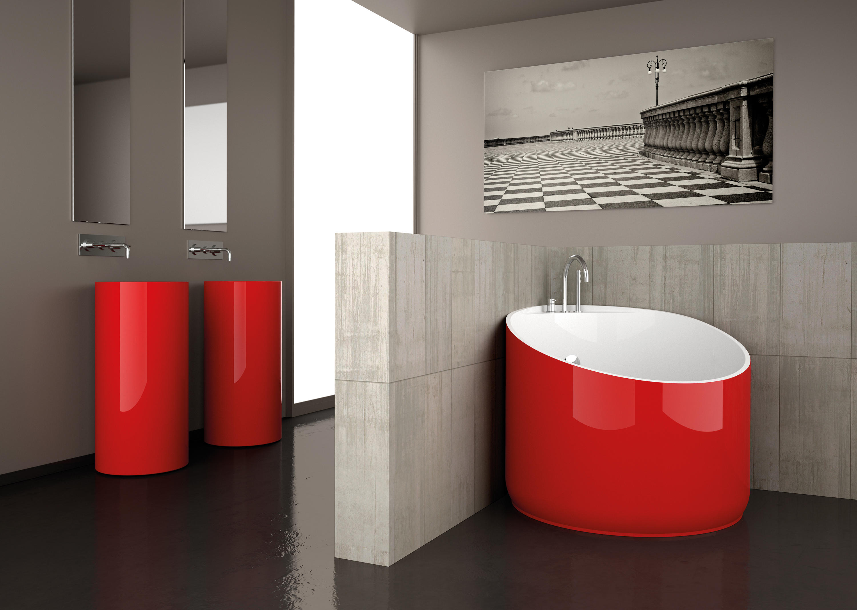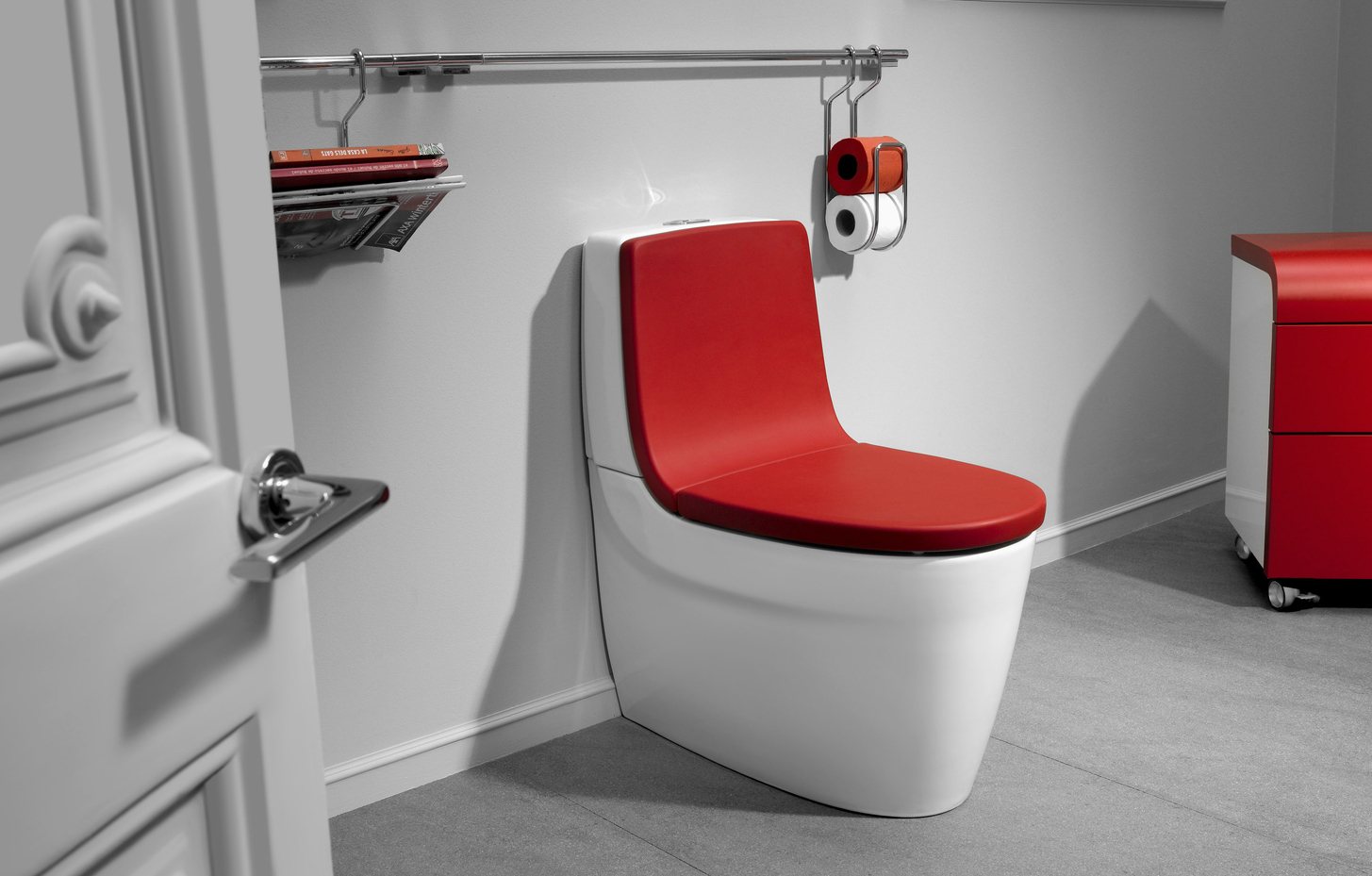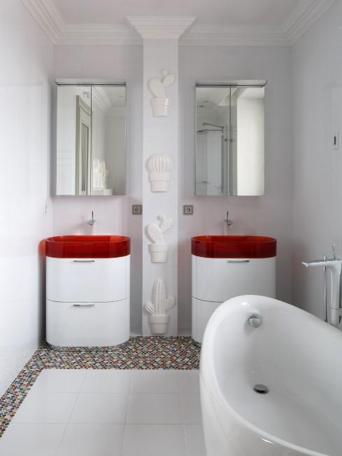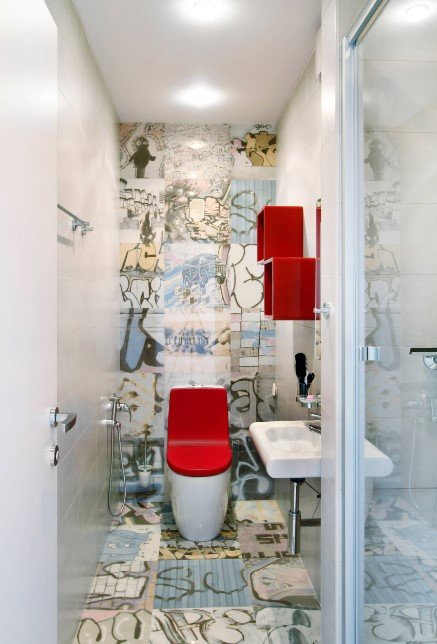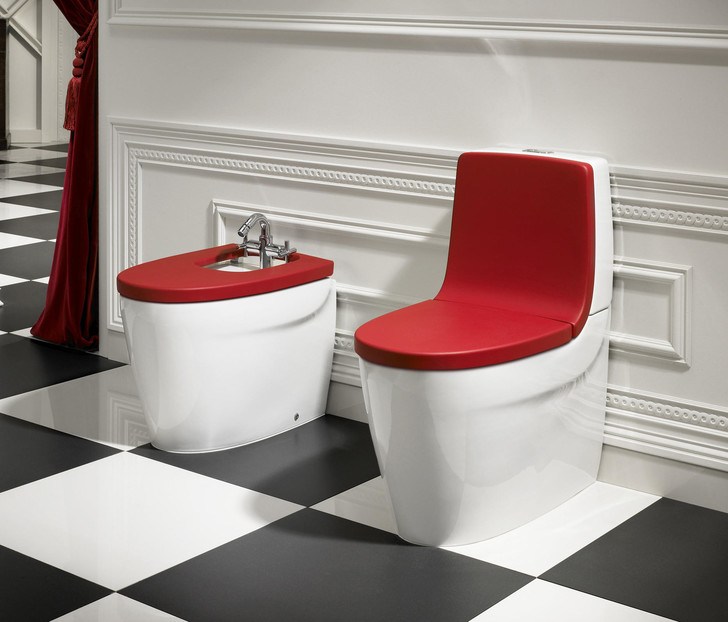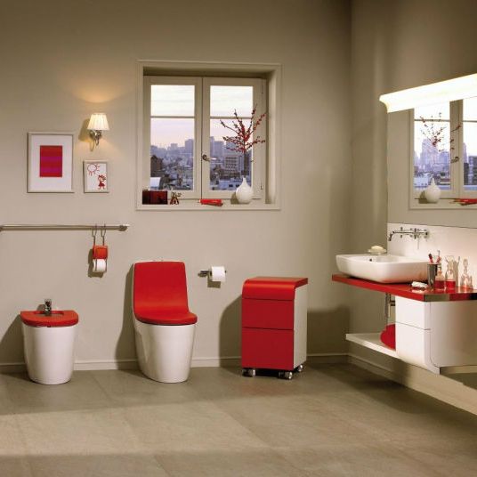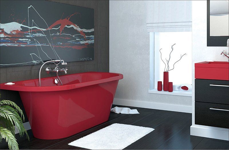 Красный цвет, конечно же, привлекателен во всех отношениях. Но использовать его для маленьких комнат не рекомендуется. И вообще с алыми вариациями следует быть осторожнее. Красный лучше использовать в санузле в минималистическом стиле. Он также хорошо сочетается с серым цветом и материалами из камня или бетона.