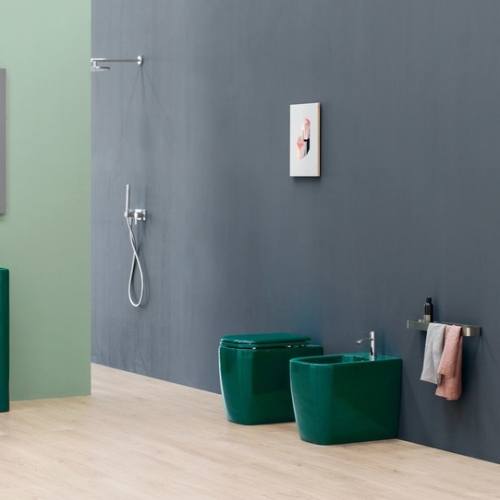 При этом цветная сантехника должна контрастировать с прочей обстановкой. Если использовать яркие цвета повсеместно, то можно заполучить не только ощущение дискомфорта, но и в прямом смысле головную боль.