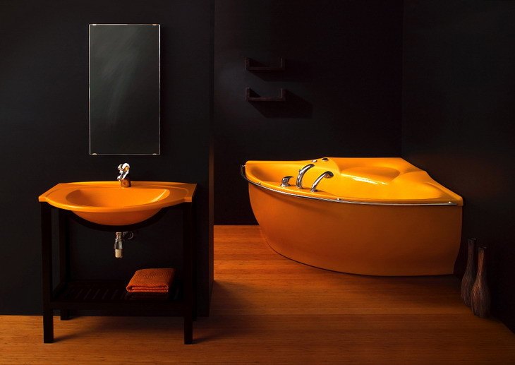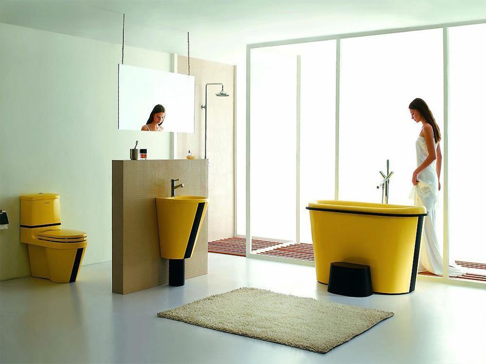 Такая массивная техника, как чаша ванной, окрашенная в желтый цвет способна визуально расширить пространство. В санузле с маленькой площадью предполагает использование желтого только в сочетании с окном. Цвет делает интерьер глубоким и насыщенным, поэтому обязательно должен комбинироваться с нейтральной палитрой.