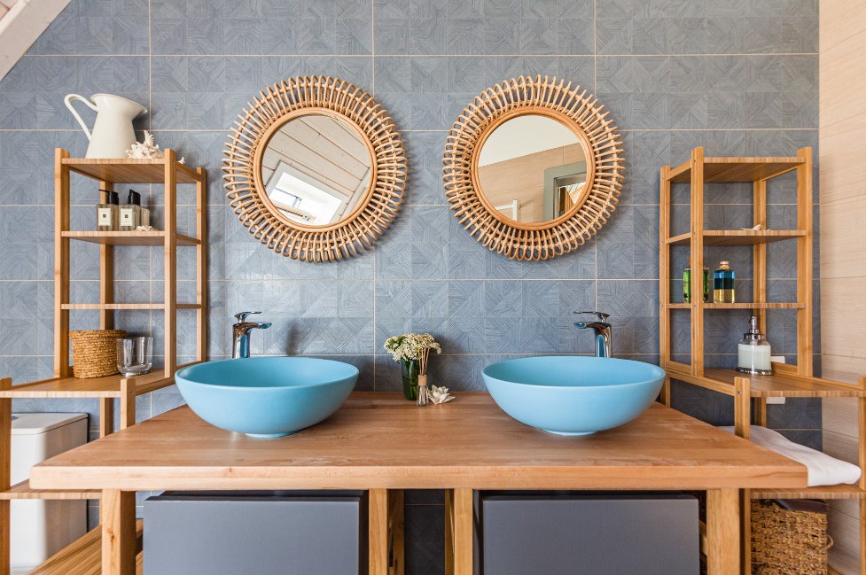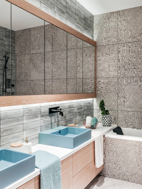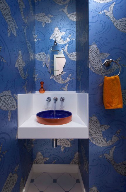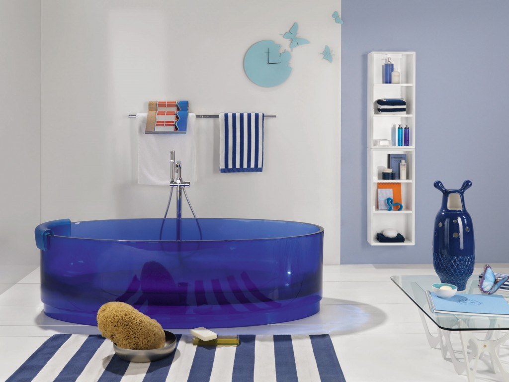 Насыщенный бирюзовый или бледно голубой – более или менее привычны для ванной комнаты. Однако использование их для сантехники предполагает сочетание с белым, бежевым или бледно-розовым цветами в покрытии. С учетом того, что голубой и синий цвета относятся к холодной палитры, то стоит разбавить ее бежевым и розовым тоном. Но если «леденящий» интерьер не пугает, что лучший вариант – белый.
