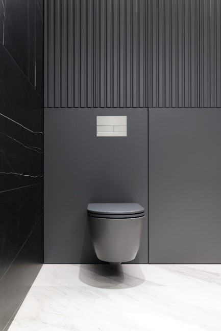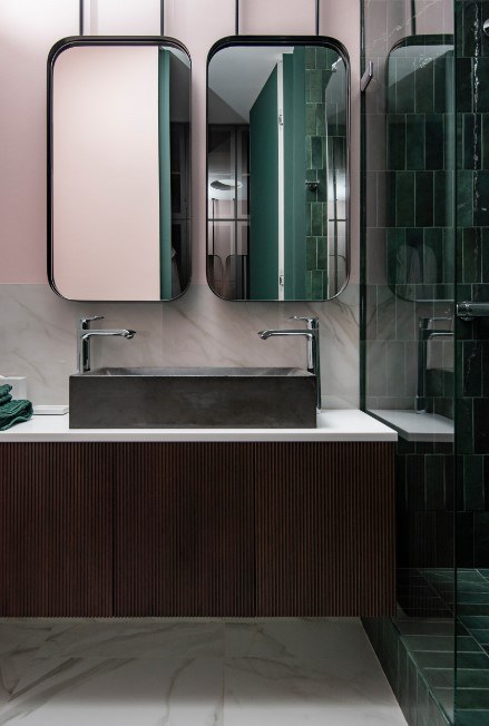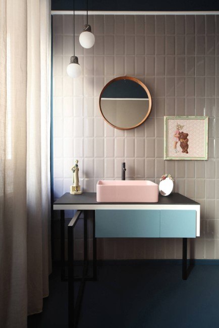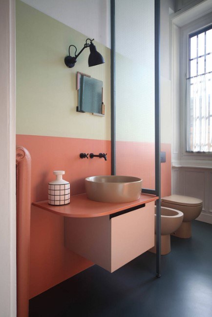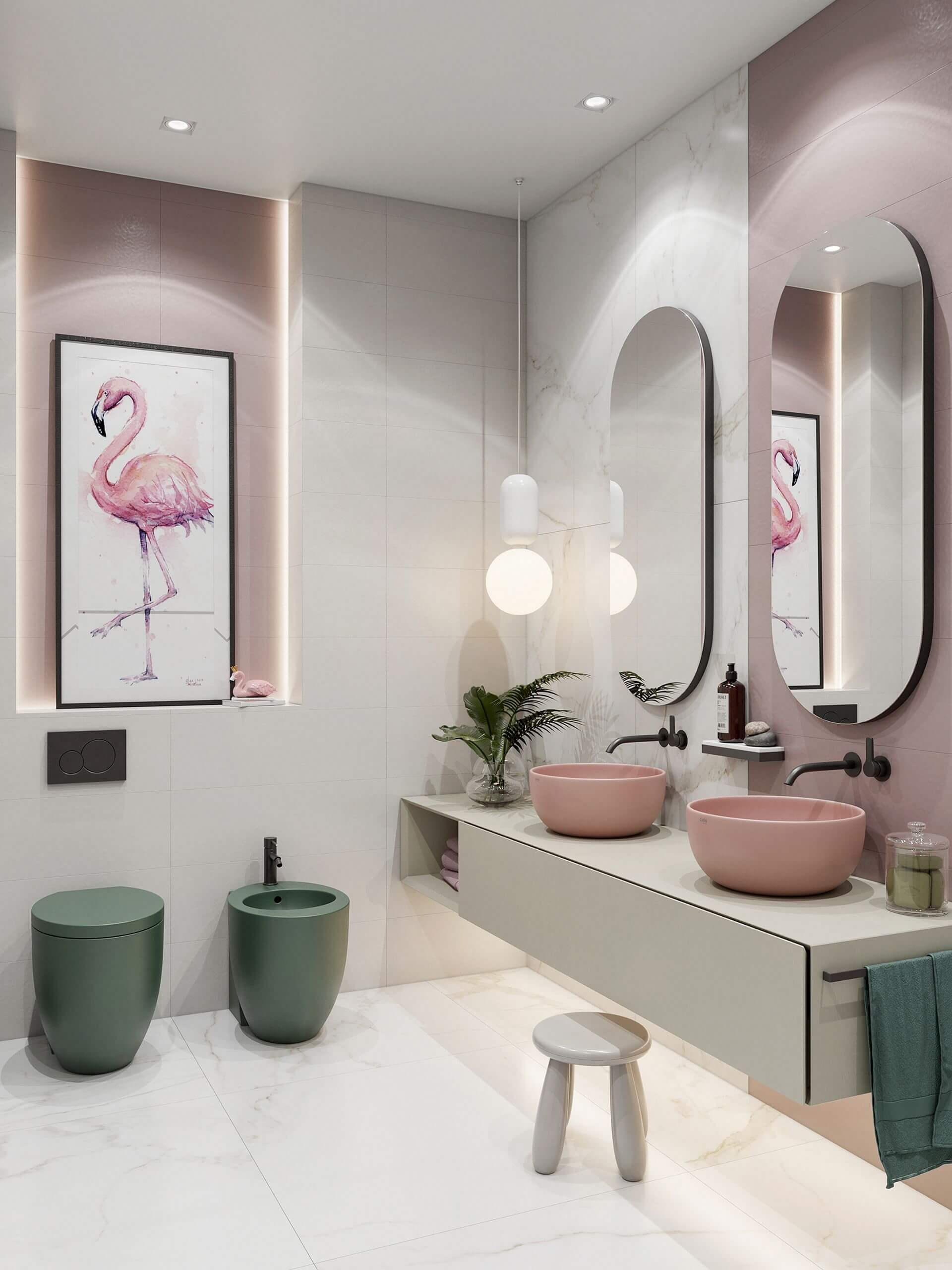 Бледные оттенки розового цвета находятся на пике популярности у всех дизайнеров. Его уже называют вторым бежевым, так как оттенок характеризуется хорошей сочетаемостью и универсальностью в целом. Бледный розовый выгодно смотрится в сочетании с другими цветами пастельной палитры. А вот тем, кто мечтает увидеть яркий и современный дизайн санузла понравится комбинация пудрово-розового с золотыми деталями и черным покрытием стен.