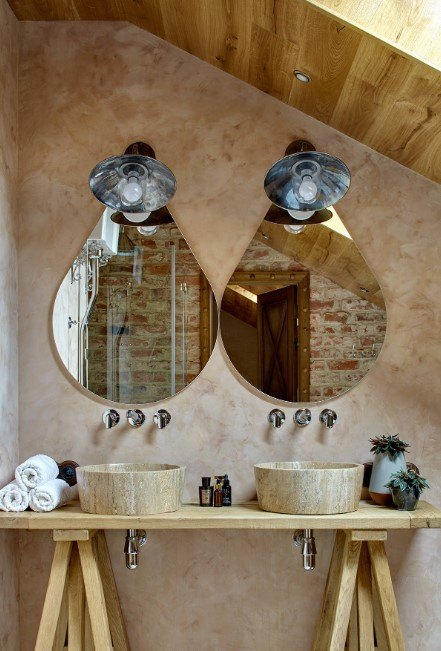 Роскоши добавят золотые смесители, крючки и держатели для полотенец. Простой и умеренный интерьер получится в сочетании с живыми растениями. Наконец, с оранжевым бежевый будет смотреться более динамично, поднимать настроении и жизненную энергию. Главное соблюдать умеренность и не отказываться на отрез от традиционного белого в интерьере ванной.