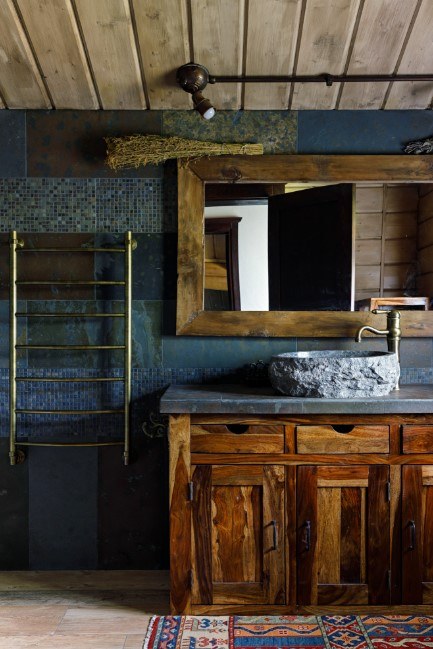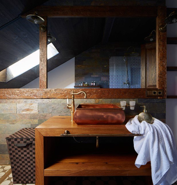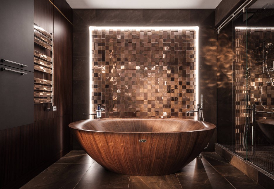 Коричневый, золотой, бежевый сочетаются между собой и могут гармонично смотреться, как в современной ванной, так и стилизованной под венецианский дворец.
