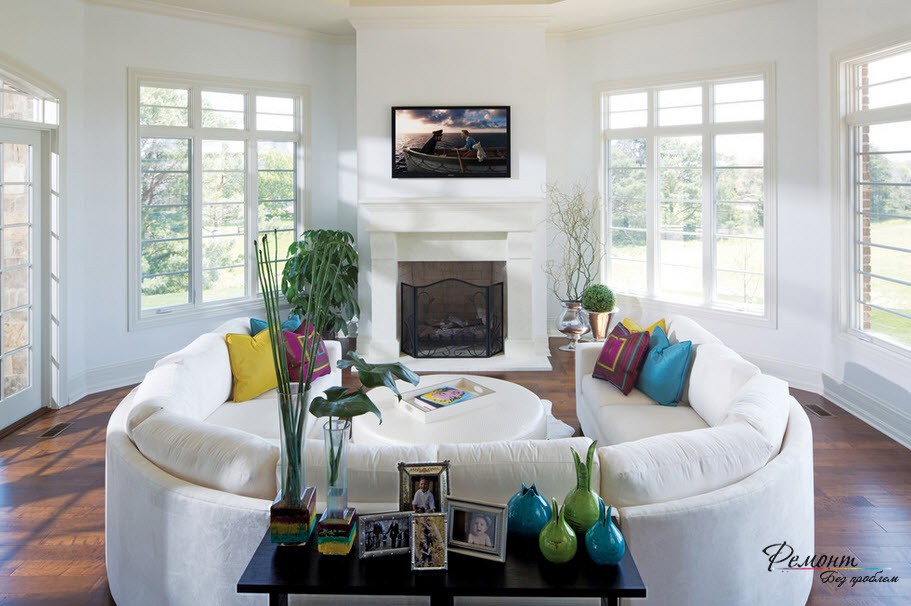 Если комната недостаточно просторная и освещённая, лучше выбрать растения с белыми цветами, которые сделают помещение более светлым и визуально увеличат пространство. Композиции со свечами, книжными полками, журнальным столиком преобразят помещение, которое уже не будет напоминать необитаемую коробку.