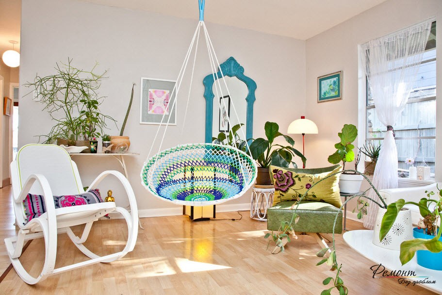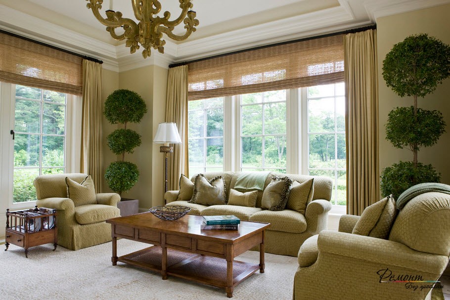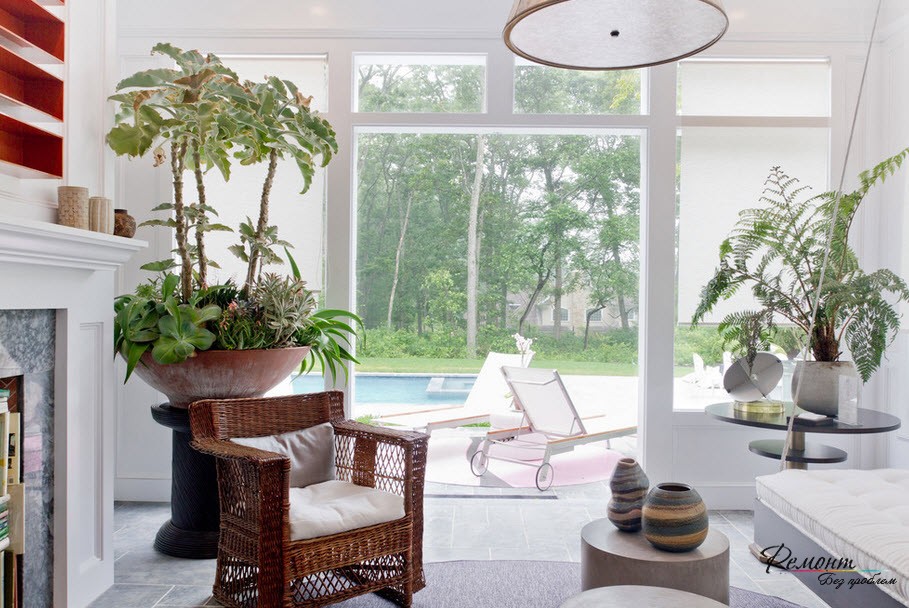 Для размещения в гостиной подходят крупные высокие экземпляры (например, фикус, пальма, сансевиерия, гибискус, кофейное деревце, бонсай), которые хорошо комбинируются с другими видами растений. Заполнить пустующий угол, можно выбрав высокое растение и перед ним разместить виды меньших размеров для создания более глубокой и насыщенной композиции. Необычного результата можно добиться, смешивая растения разных форм и оттенков.