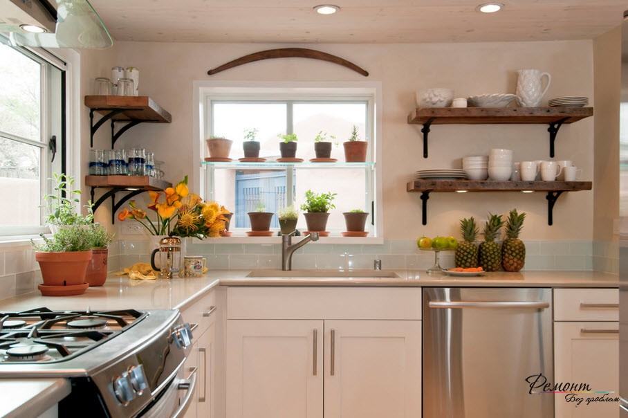 На кухне стены, подоконники, полочки и столики – удачное место для цветочного декорирования, которое к тому же очень легко осуществить. Декоративные растения вносят ноты завершённости и изящества в оформление, подобно поданной на десерт изысканно сервированной черешне, радующей вкусом, свежестью и цветом. В зоне приготовления пищи лучше использовать растения насыщенного зелёного или жёлтого цвета, которые благоприятно влияют на настроение и «согревают» интерьер. Главное – не слишком «переборщить» с количеством и разнообразием цветочного декора. Следует избегать цветущие виды из-за неблагоприятного воздействия повышенной температуры и влажности, характерных для этого помещения. Можно заменить их ароматными травянистыми сортами, которые не только позволят оригинально декорировать пространство, но и выступят в роли специй, которые можно добавлять в блюда (базилик, шнитт-лук, орегано).