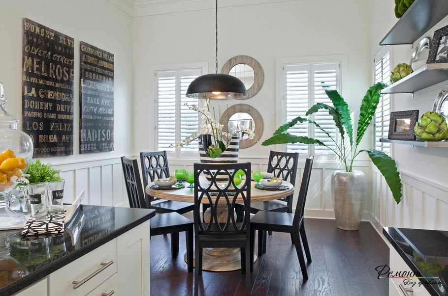 В столовой комнатные растения в тщательно подобранных декоративных вазонах – элементы украшения, которые сочетаются с общей темой дизайна, гармонируют с каждым его объектом и создают атмосферу изысканности и элегантности. Например, высокие свечи с белыми цветами придадут утончённости романтическому ужину.