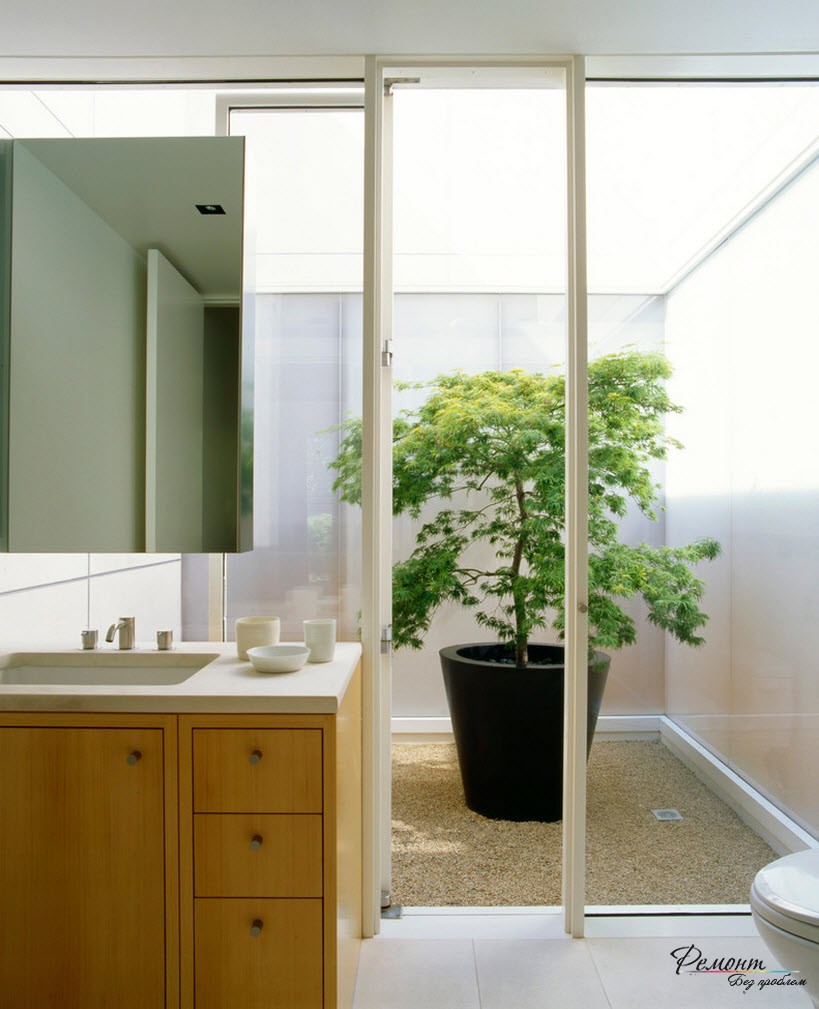 Санитарную зону зачастую не рассматривают как подходящую для фитодизайна. И это большое упущение. Частичка природы здесь особенно уместна. В ванной комнате превосходно будут себя чувствовать влаголюбивые растения (папоротники), за исключением тех, которые не переносят перепада температур. Растения можно культивировать в небольших горшочках или подвесных кашпо, а если позволяет площадь, то небольшое деревце создаст настроение релаксации на лоне природы.