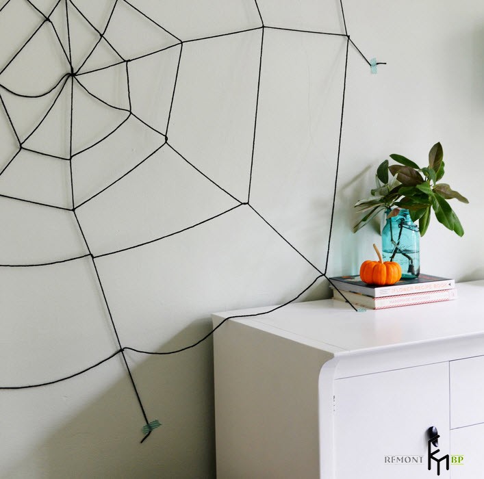 Размер паутины зависит от места крепления и Вашего желания! Интересно смотрится несколько паутин разных размеров. Также можно использовать разноцветные нити – так композиция будет выглядеть оригинальнее. Ну и, конечно, окончательным штрихом будет игрушечный паук, его можно закрепить на паутине тонкими нитками.