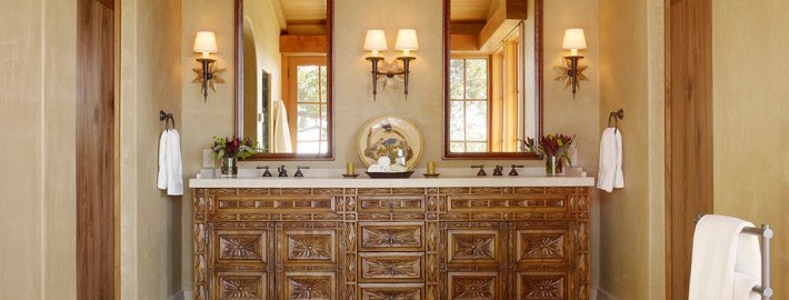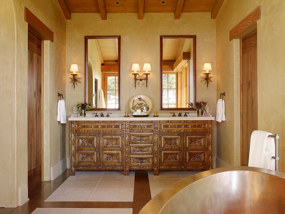 Помимо всех перечисленных технологий для создания рельефа, имеется и другой вариант – оштукатуренную стену можно попросту раскрасить при помощи имеющихся в продаже «магазинных трафаретов» и, таким образом, создать уникальную декоративную штукатурку в ванной комнате.
