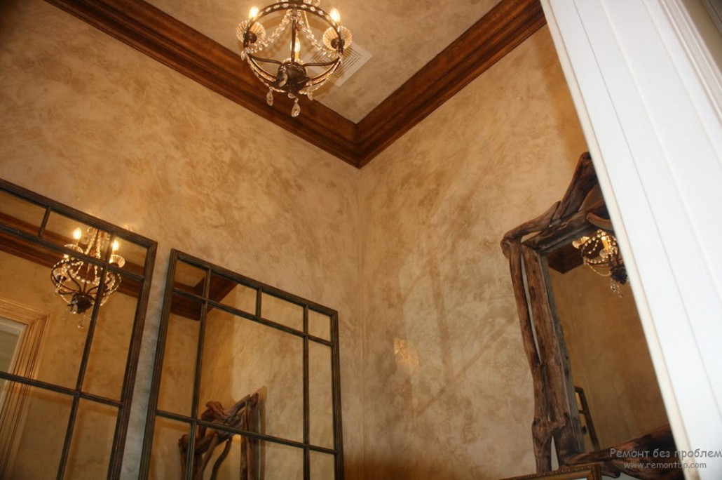 - венецианский – прием осуществляется посредством послойного нанесения особых смесей с разными оттенками, после чего выполняется многократная затирка, а также соскабливание слоев, данный метод способствует созданию прекрасной имитации натуральной каменной кладки, правда, стоит отметить, что это самый сложный вариант